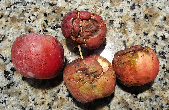 Karmijn de’ Sonneville and Liberty, at least this year. Had a Liberty the other day that had hung on the tree longer than usual, was almost black in color- really, really good. Juicy, firm, complex-flavored, crisp and aromatic. Not as sharp as the Karmijn, but well balanced sweet/sour quality. Streaked with red just under the skin. But there is something elusive in the Karmijn that no other apple I’ve eaten has.