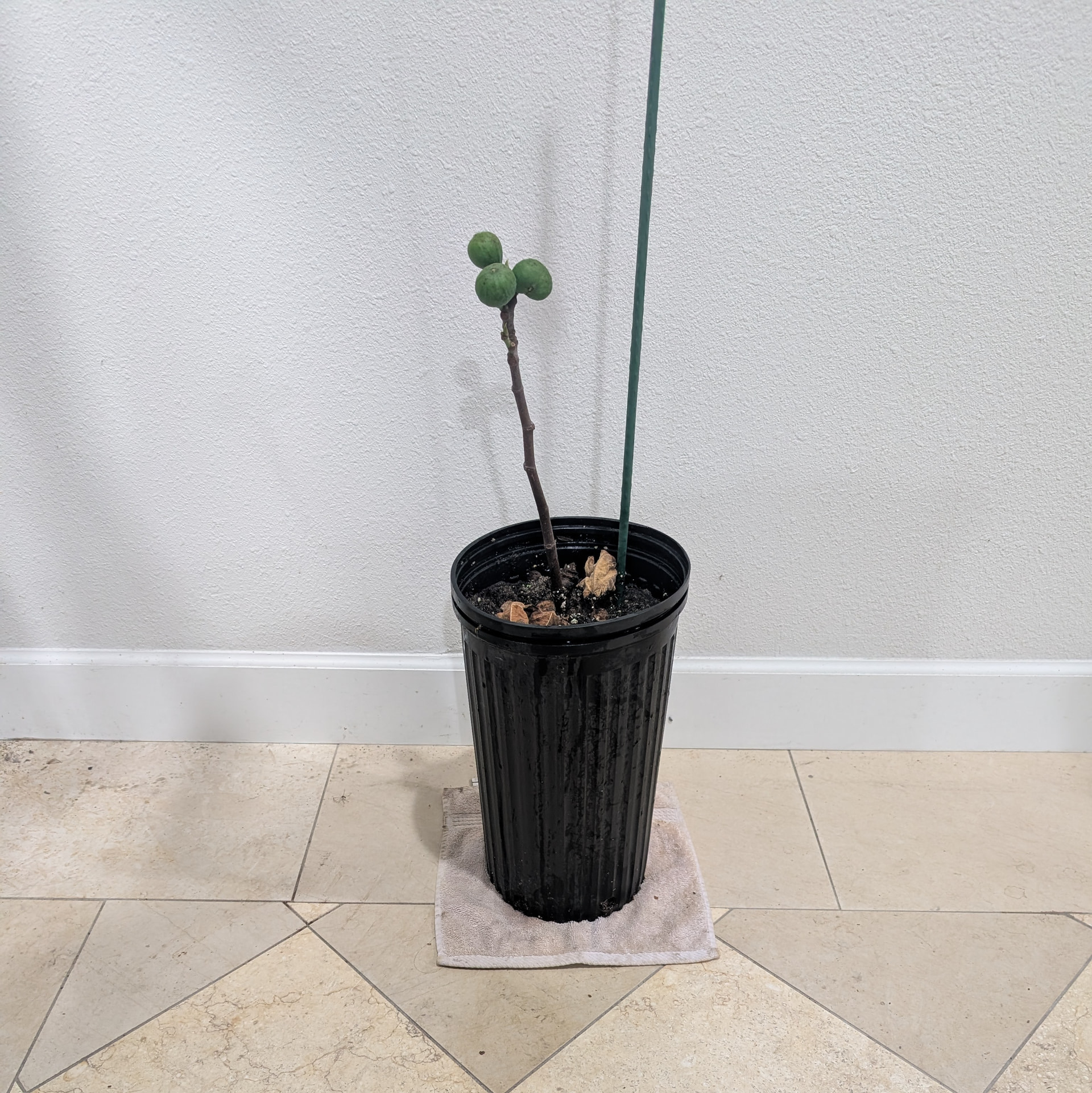 Three syconia that emerged last November on an LSU DC-6 clone. They are now about 1" diameter. It has been unusually warm here the past three weeks. The plant was brought indoors after dark for the photo.