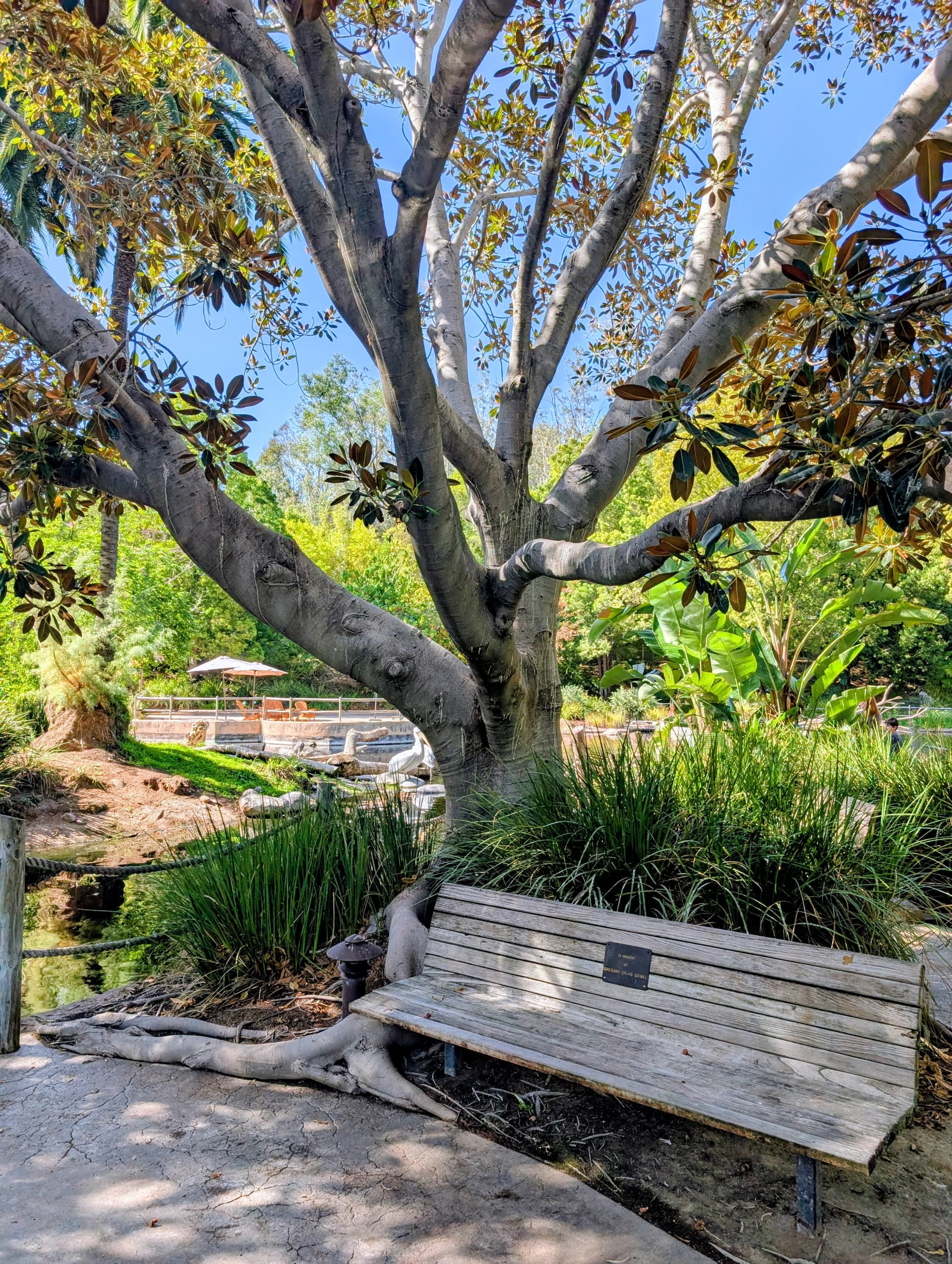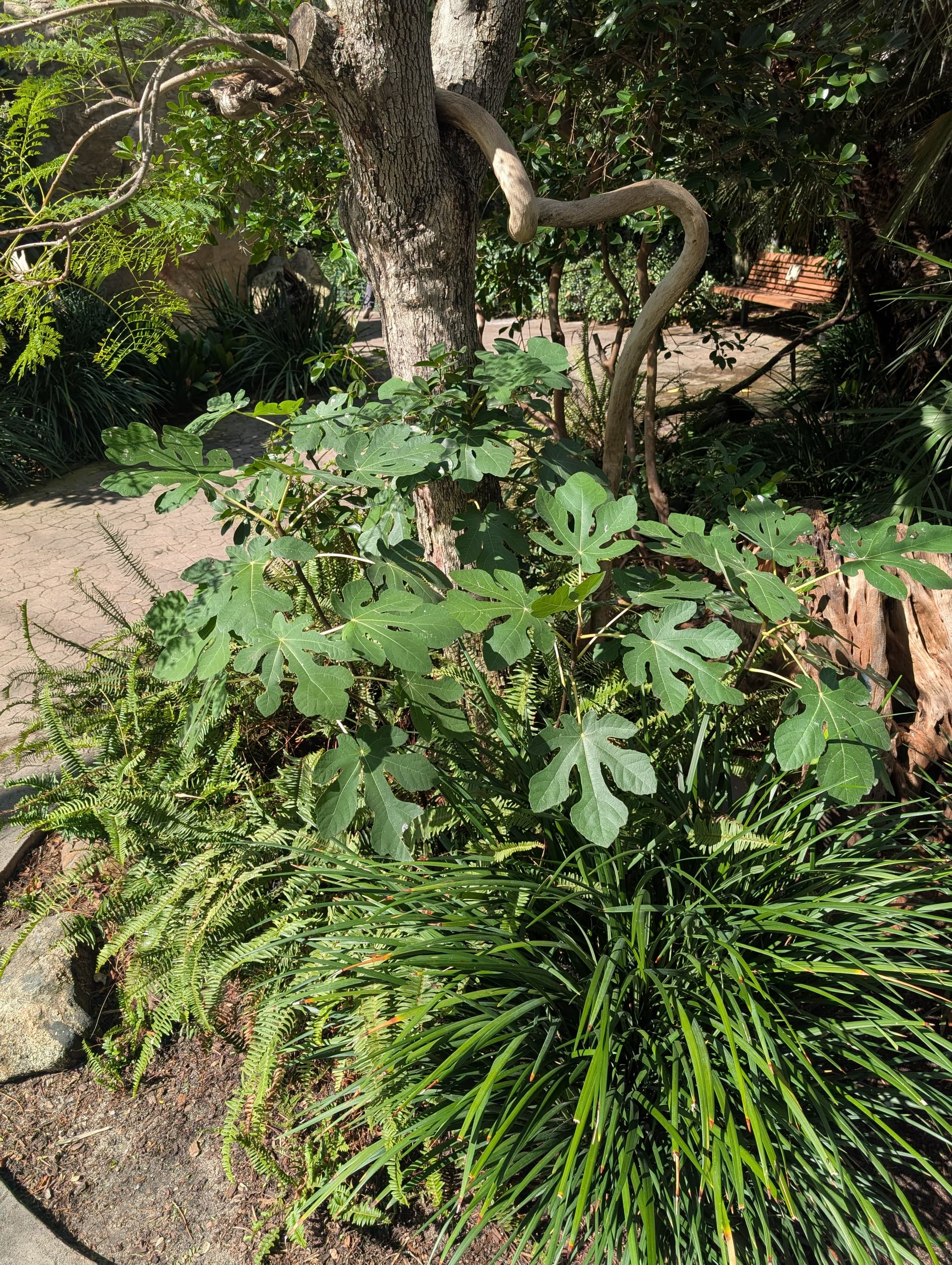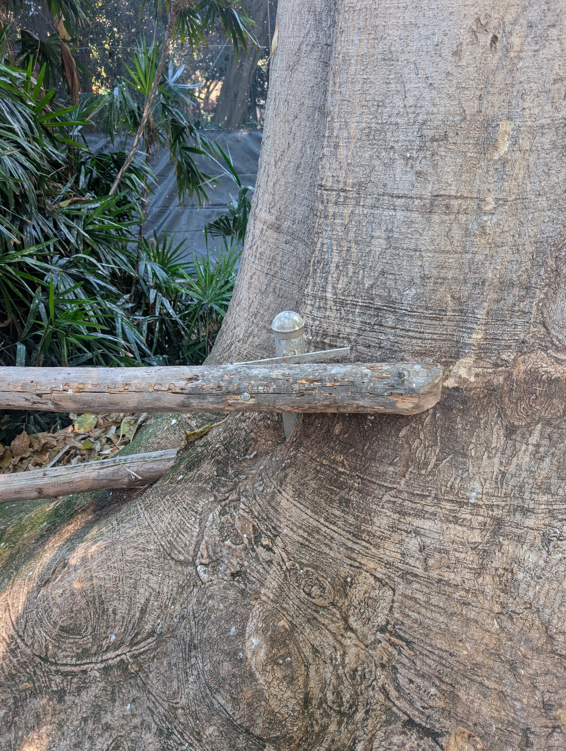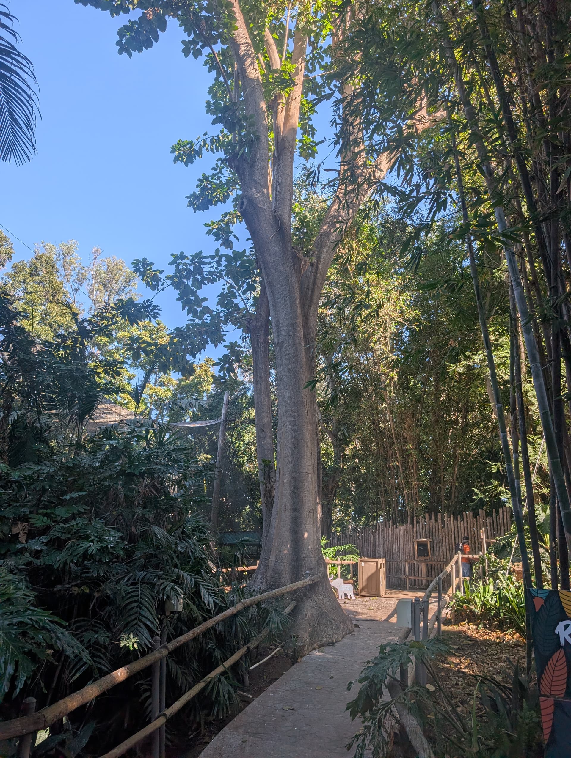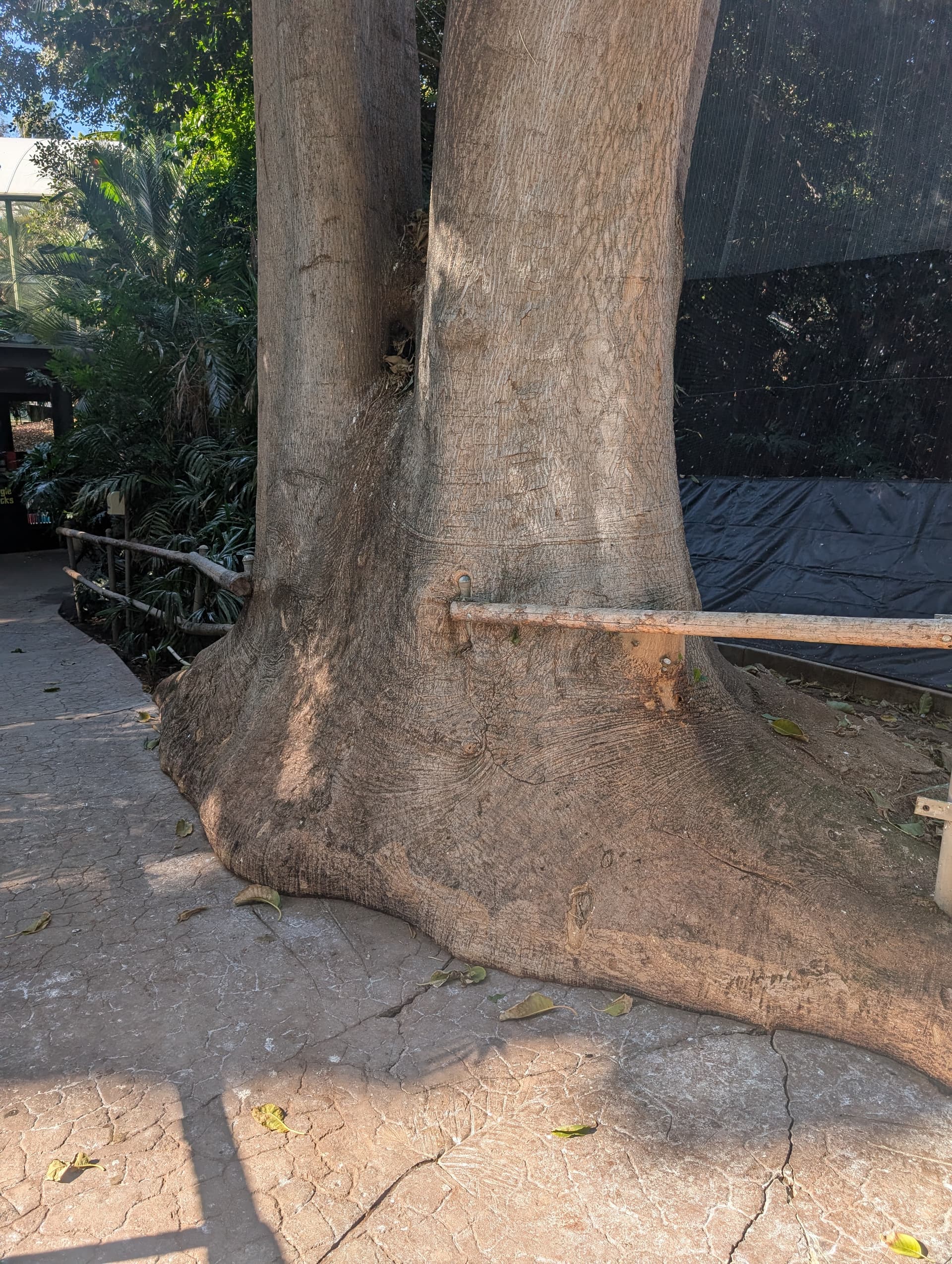 Ficus specimen devouring sidewalk and railing at exit from the Rainforest Aviary at the San Diego Zoo Safari.