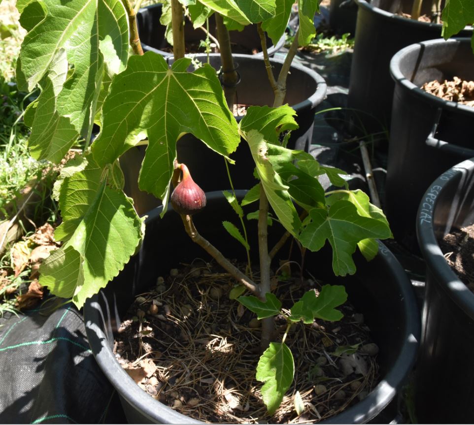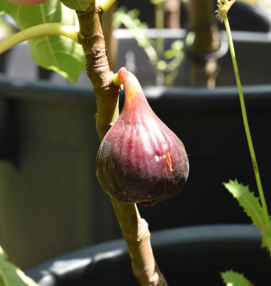 First fig of a small unknow tree, probably bland from being watered one time a week to full pot capacity, so the trees can survive all week.