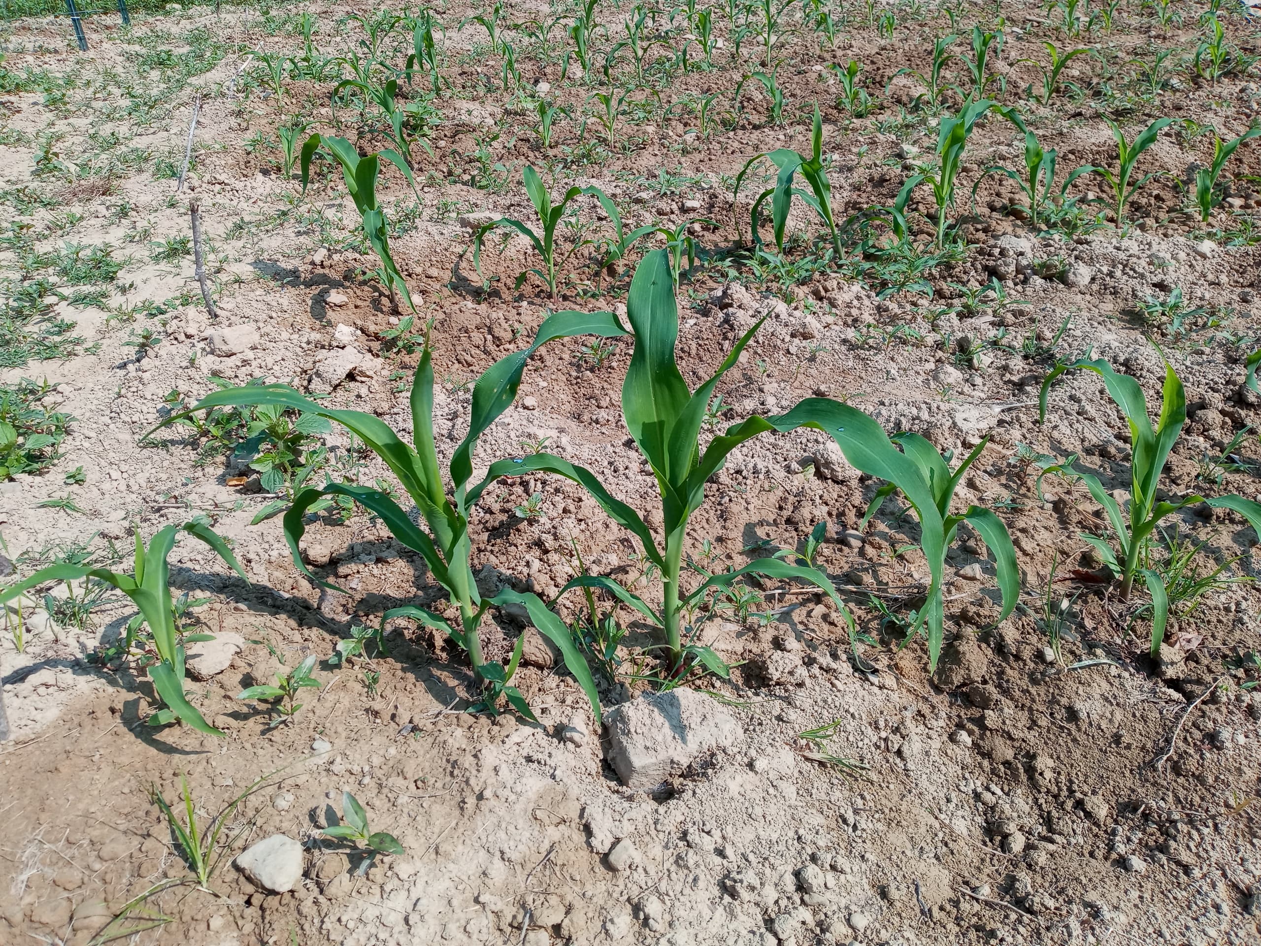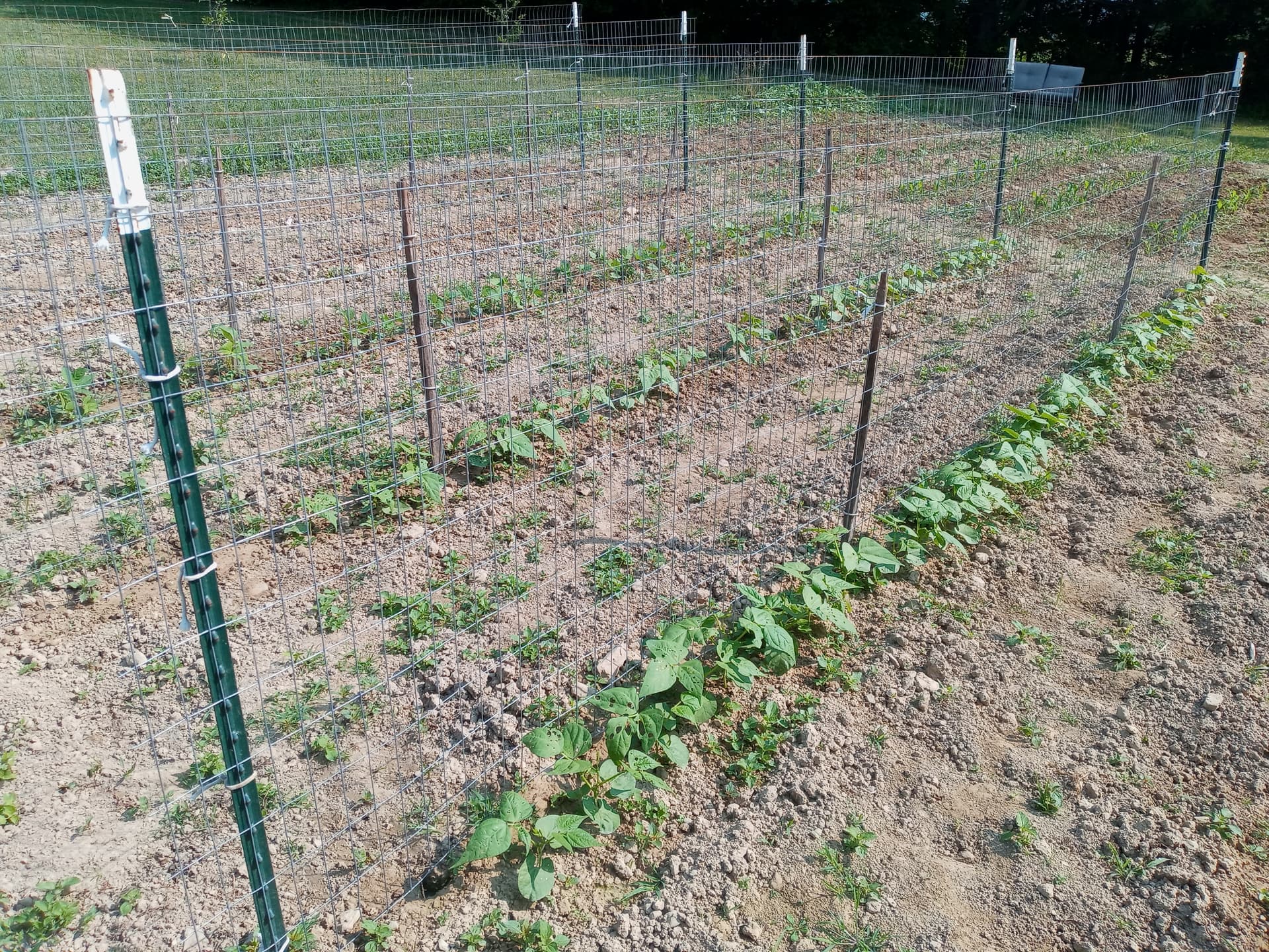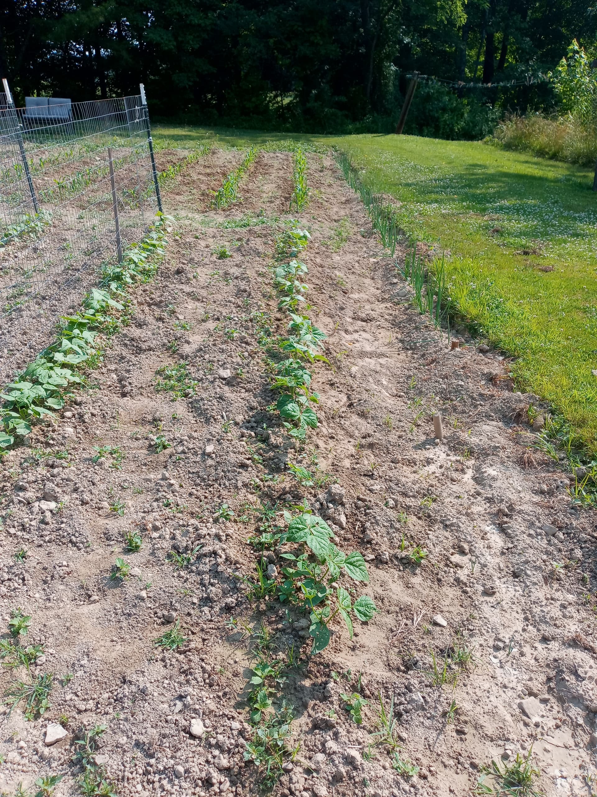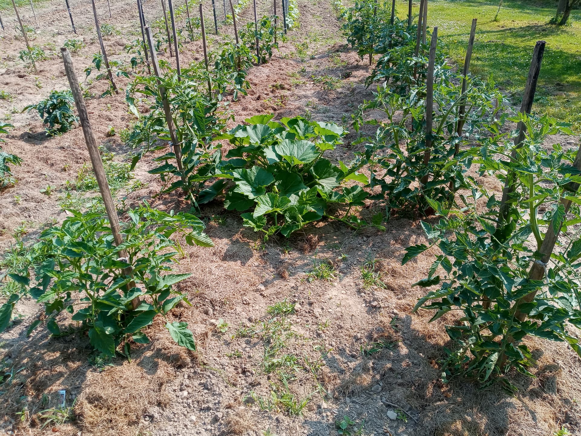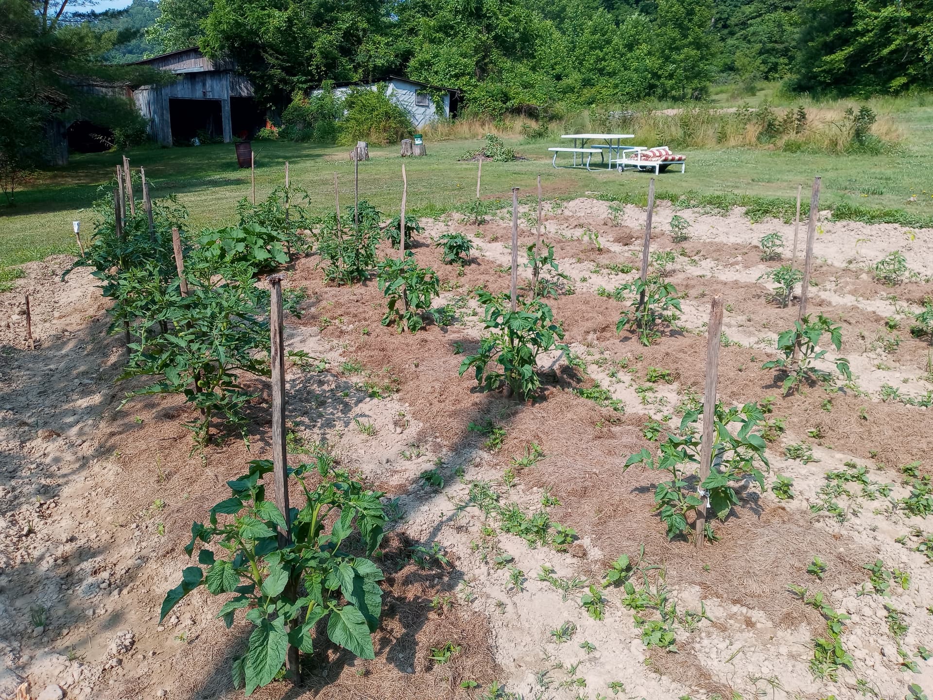 Rows of tomatoes with a volunteer pumpkin that sprung up from last year’s crop