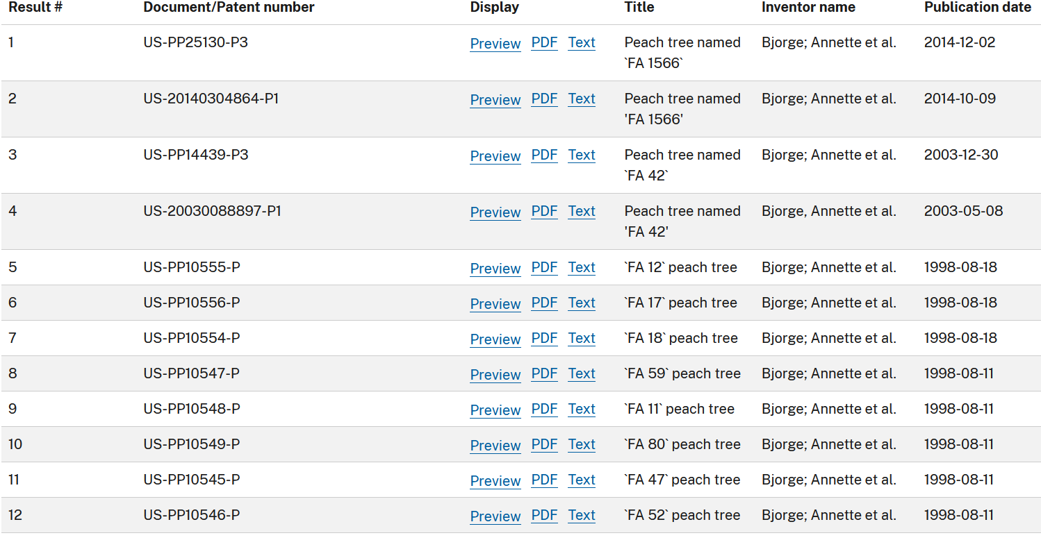 For example, if I wanted to know the patent info for their newest selection called “Sweet Star” peach, I wouldn’t be able to find the patent because it’s not listed as Sweet Star. However using the inventor search, I see their latest selection is FA 1566. Plugging that in an internet search yields the name “Sweet Star”.