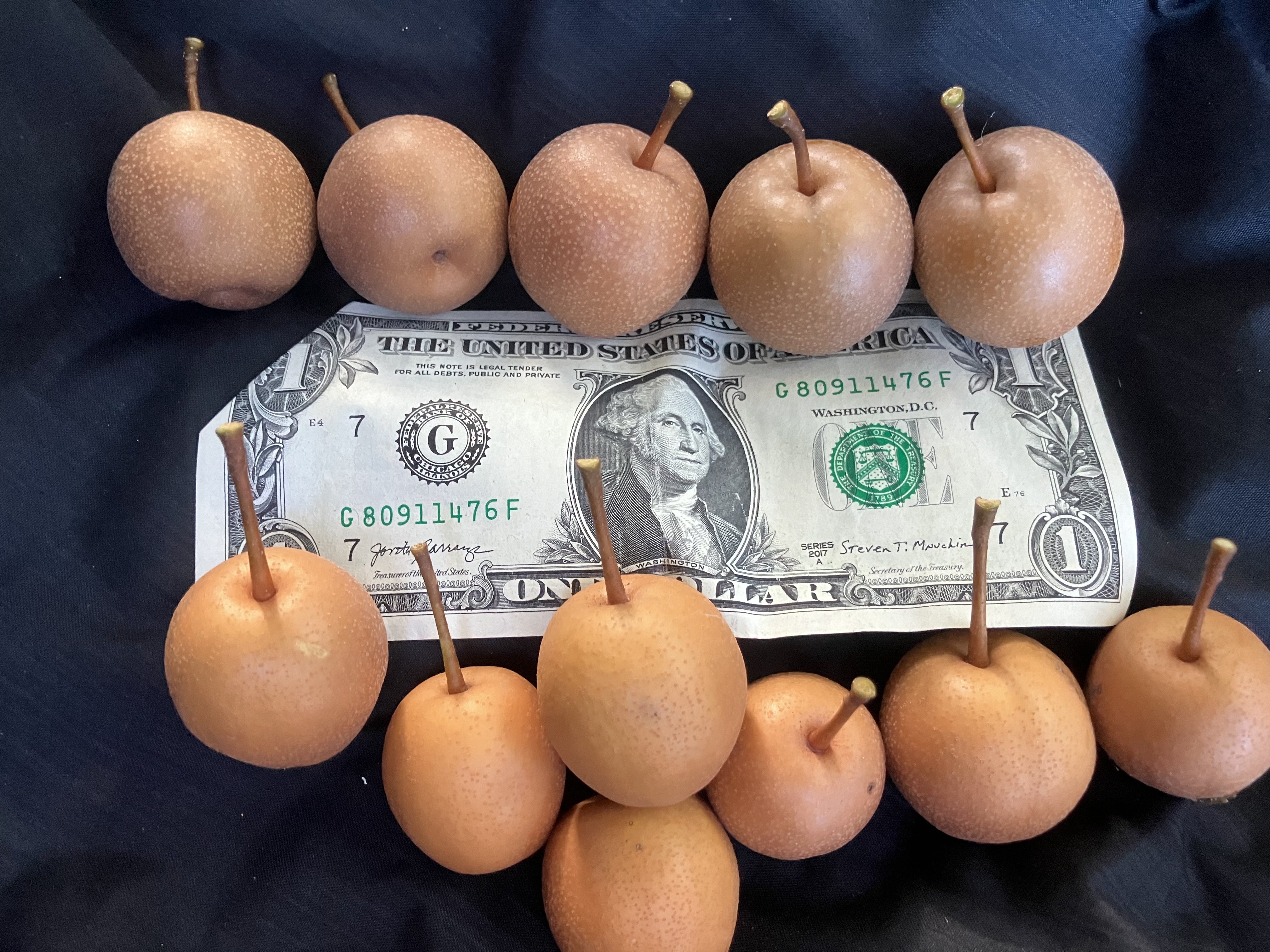 Posting here in case it’s of interest to anyone else. The pears are starting to fall, though most are still hard. I assume they have tipped out on size. The darker, rounder fruit above the dollar is from the smaller tree, fruit below the dollar is of very similar height but are smaller in diameter.