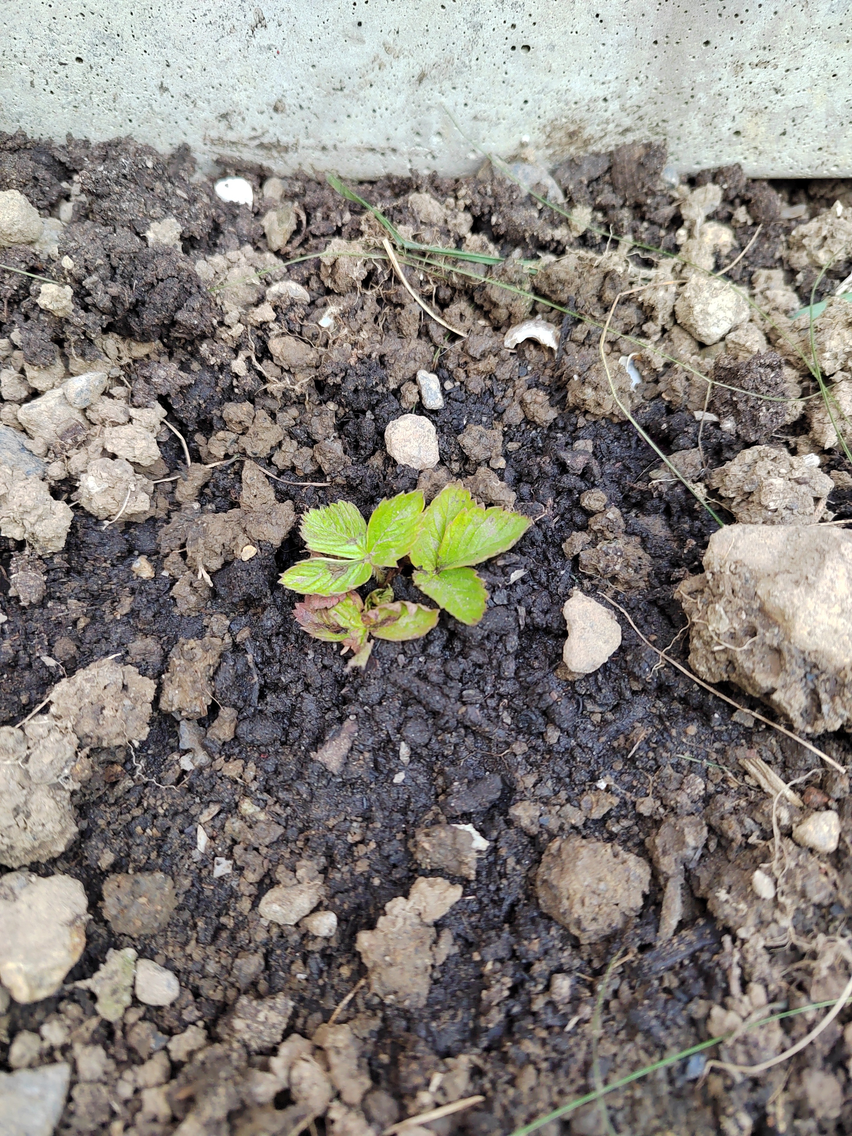 I found a little strawberry plant growing in the stone gravel path outside my allotment garden. The area had previously been used for allotments, then dug up, soil removed, divided into new allotments, and gravel put down for paths. So it was effectively growing in no soil, but may have been there previously, or a seed suddenly sprouted. The leaves are tiny, and I think it may be an alpine. I dug it out, and planted it in the soil with lots of compost. Hoping it will live and be productive.