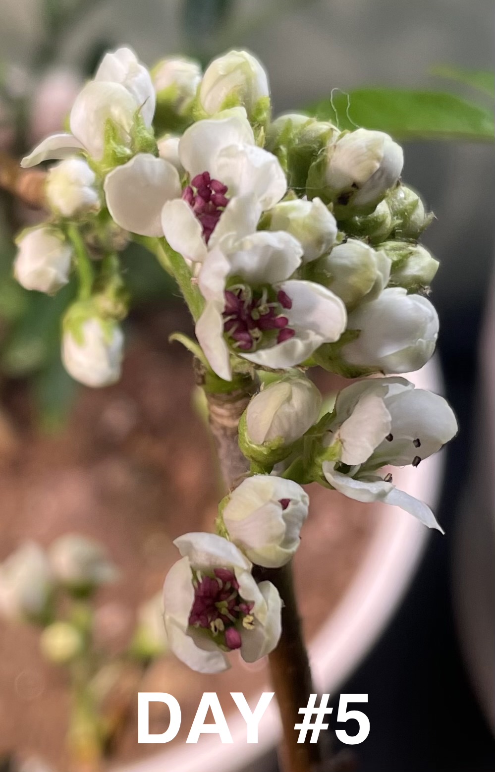 The Callery pear trees had buds that were the furthest along, so I cut several branches with flowering buds. I brought them inside, put them in water, and under LED lights. Five days later, I had Callery pear pollen ready to use. The trees from which I took the cuttings are at least a week or two behind, if not more.