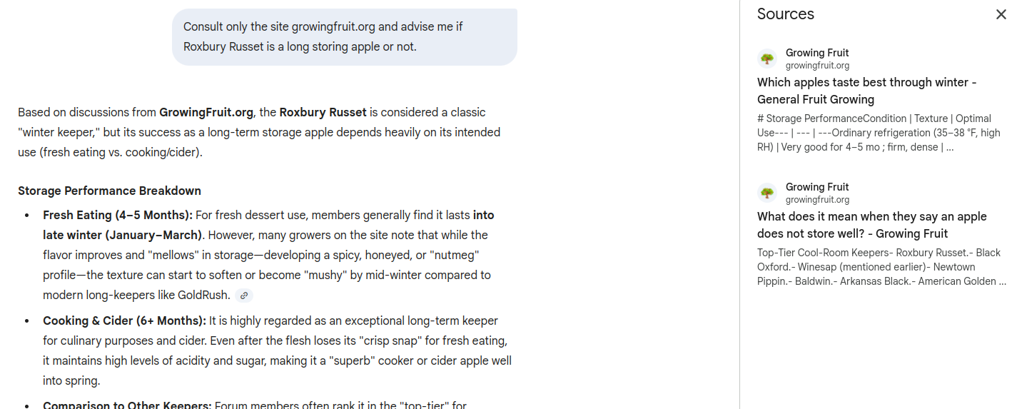 Currently, you could search any AI for growing advice and get information from real people on this forum and others. It is often quoted in ways like these people had this growing experience etc. so let that be where it is. This site is a human social network of people having and sharing their human experiences with growing fruit. Our search bar works great. If you post youāll likely get responses, all works well. Please let it stay that way.