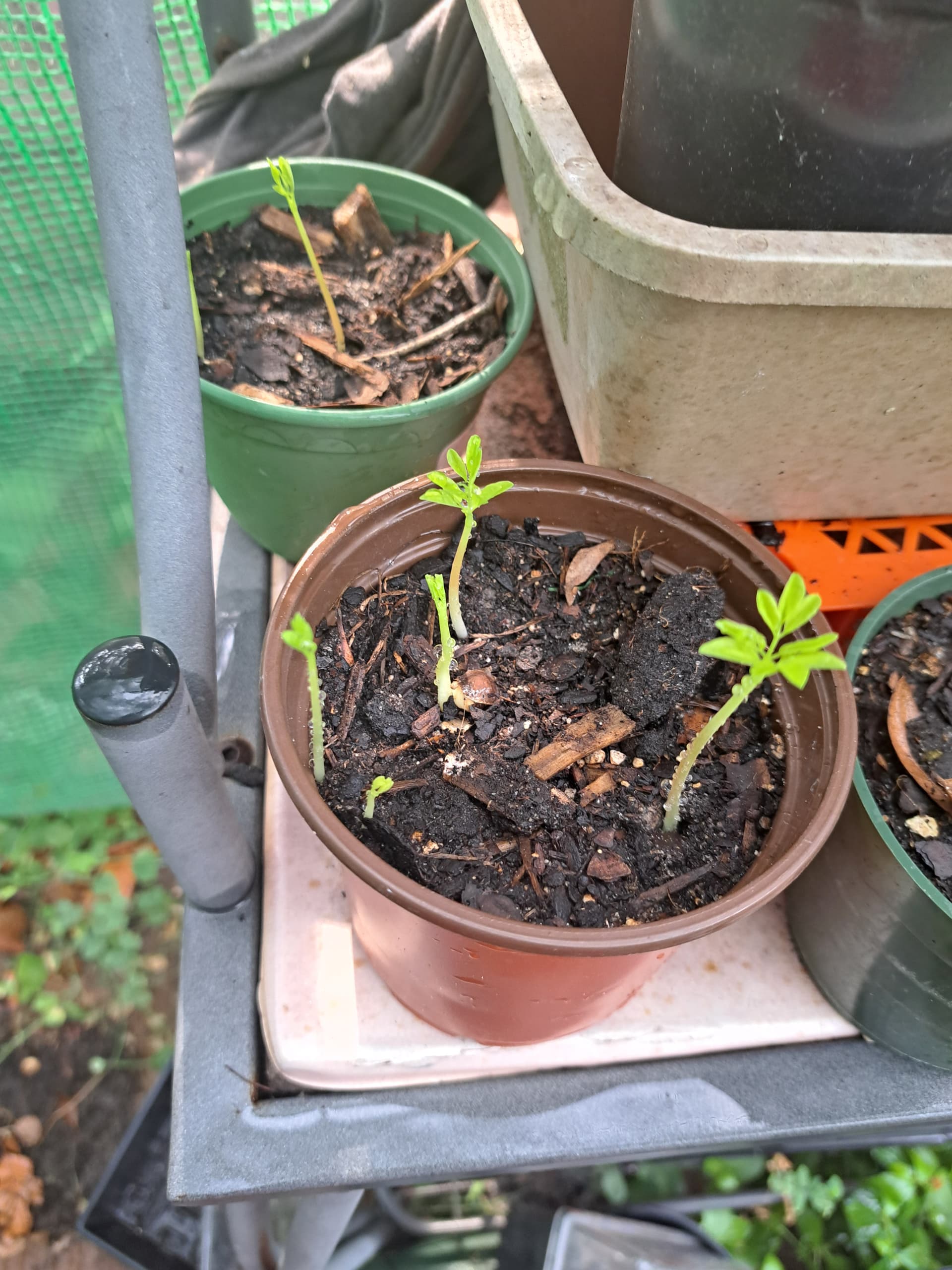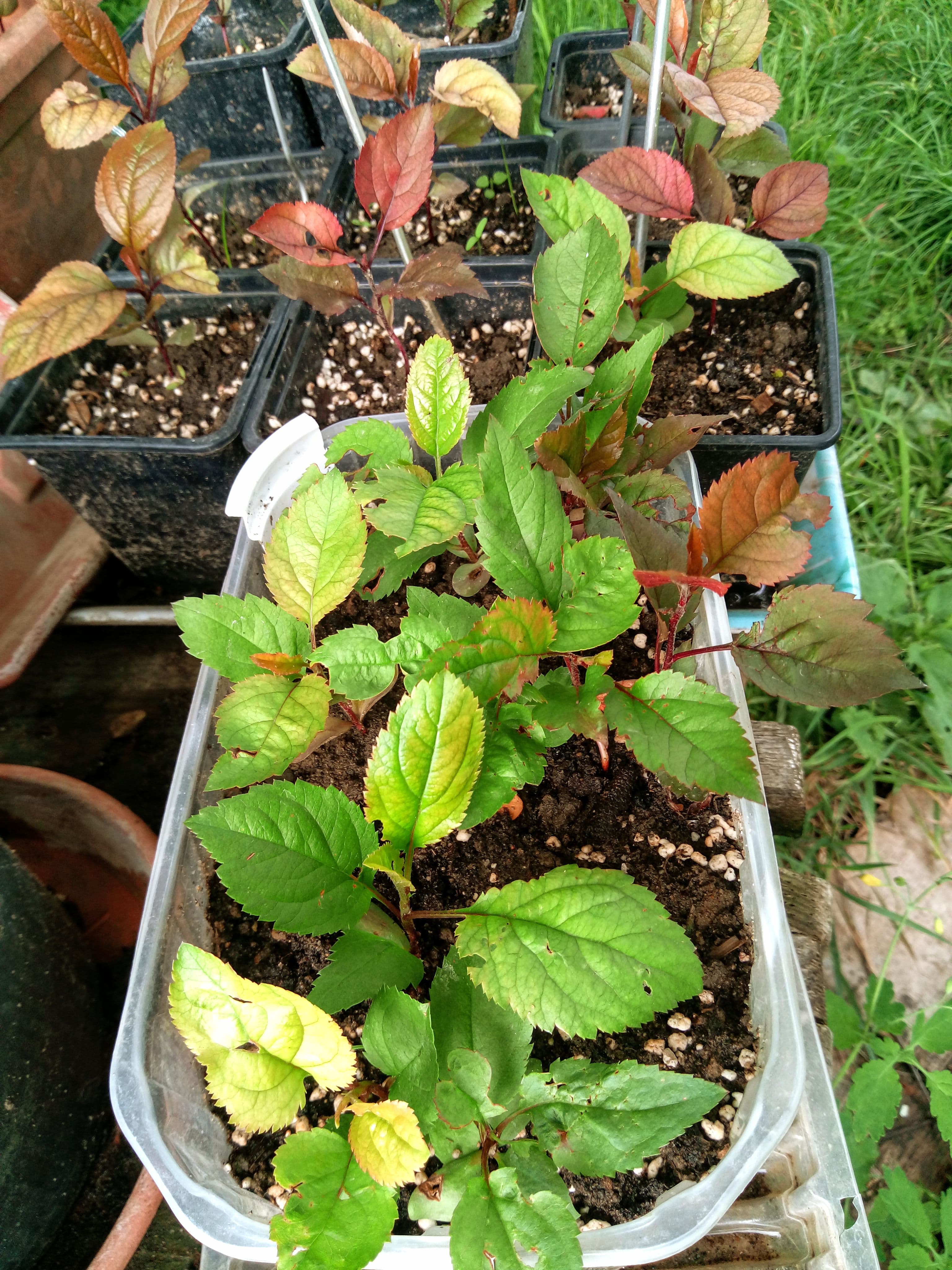 A rather interesting colour development of my Baya Marisa apple seedlings. I have separated about a quarter that have pure green foliage. I have expected the burgundy ones like the mother plant. I have some from 3 years ago that are green with a light pink-yellow blush. But I am really looking to grafting these on a multi-variety tree with the more intense yellows and the reds that pass through pinks and oranges to get to the mature brownish dark greens. Even if the fruit will be mediocre (doubtful) the ornamental appeal will be worth it.