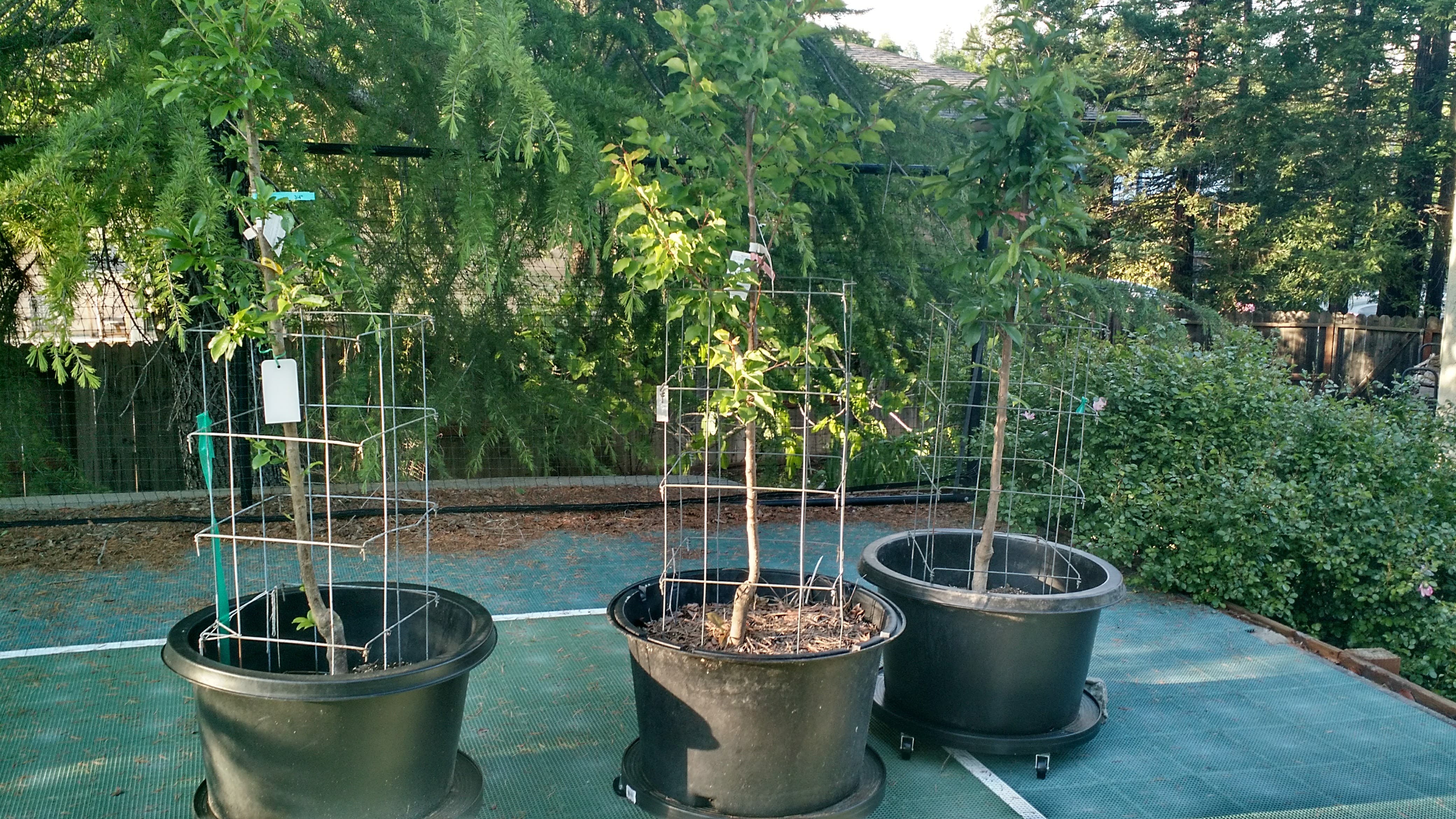 I have an apricot and two pluots, about 5 or 6 years in plastic wine barrel liners. They are on automatic drips in the summer with about three emitters each, twice a day for ten minutes, at which point the water is running off the trays beneath.
