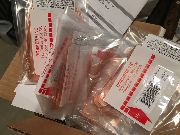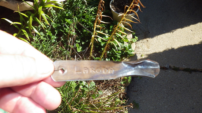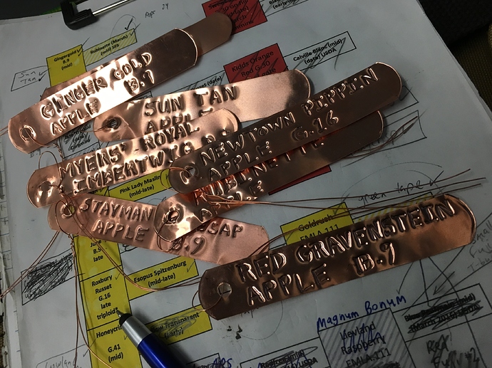 I have a sheet of rolled up copper that I cut out tags. Found the roll in the barn that has been there for years… I was just looking up some images so I could attach to my reply and saw how much it is selling for… WOW… I might decide to go something not so EXPENSIVE!! You also, have to be careful not to cut yourself. I use 0.041 in. Stainless Steel Lock Wire, 1 lb. Coil from Harbor Freight to hang them and it doesn’t break.