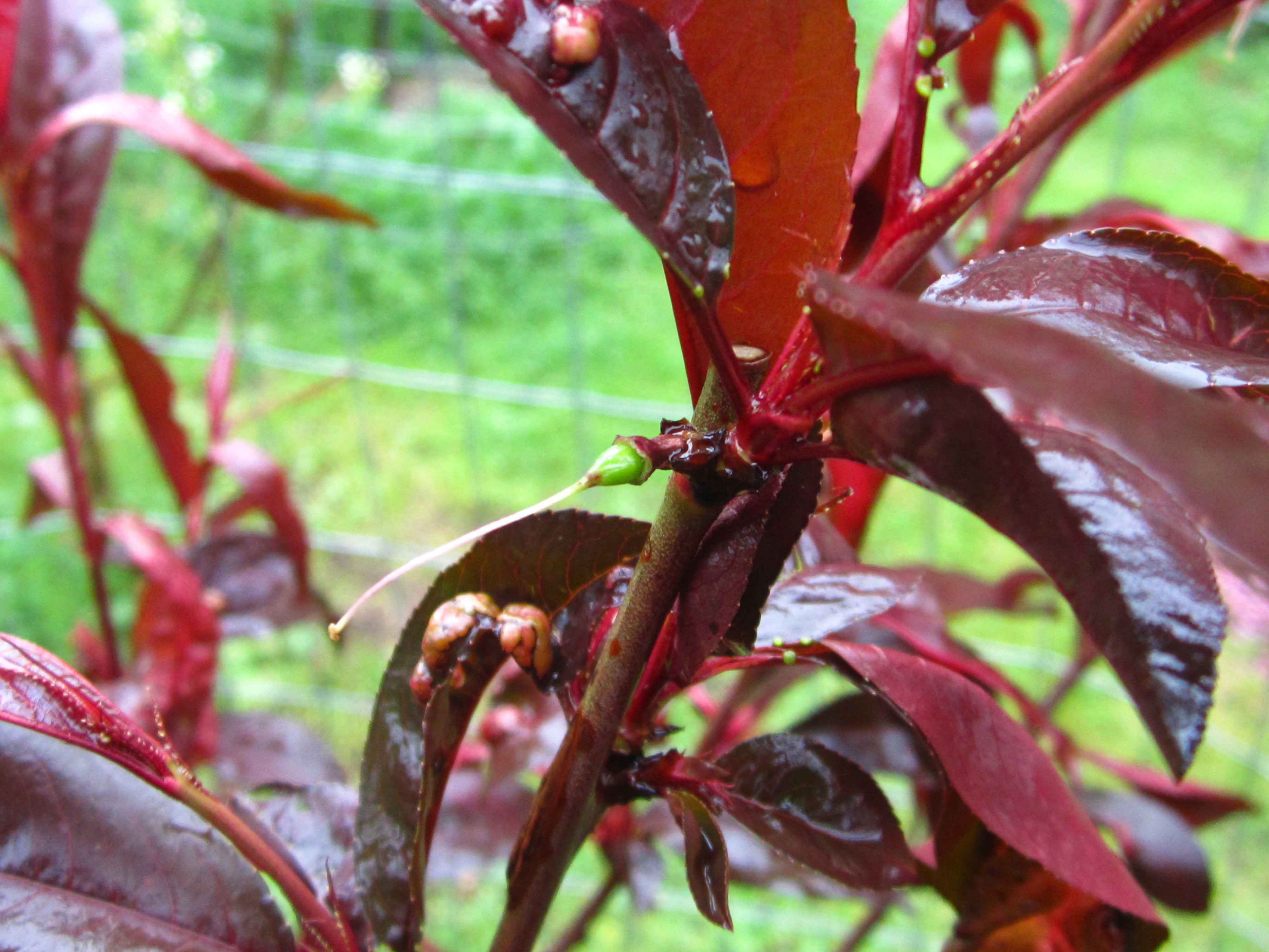 The purple foliage of Flat Wonderful is very pretty. I used to grow Flat Wonderful, but cut down my one tree last fall. It was healthy and productive, but I cut it down because it was close to an oak tree in my back yard. When I first planted the peach tree there, the oak was smaller and didnāt shade the peach too much.