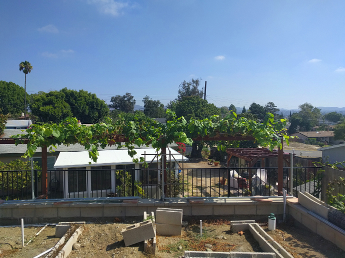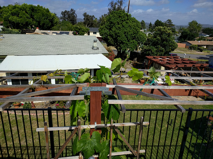 Last Fall I planted out a cutting at the south end of my vine trellises. These are five connected T-type, 8’ tall and 16’ wide. Here it is to date: