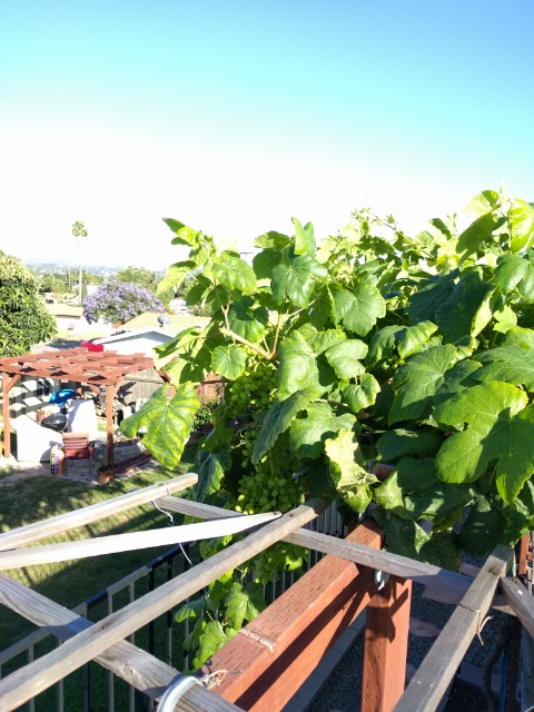 The shoots I’ve been training upwards have overshoot the top by at least a foot, so today I tied them off horizontally onto the “T”. In the background you see my neighbor’s yard.