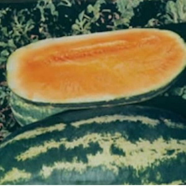 Beautiful orange flesh. This 22-24 lb melon has a very distinctive dark stripe, an oblong shape and small black seeds. Ships, handles and holds better if picked fresh. Very productive.