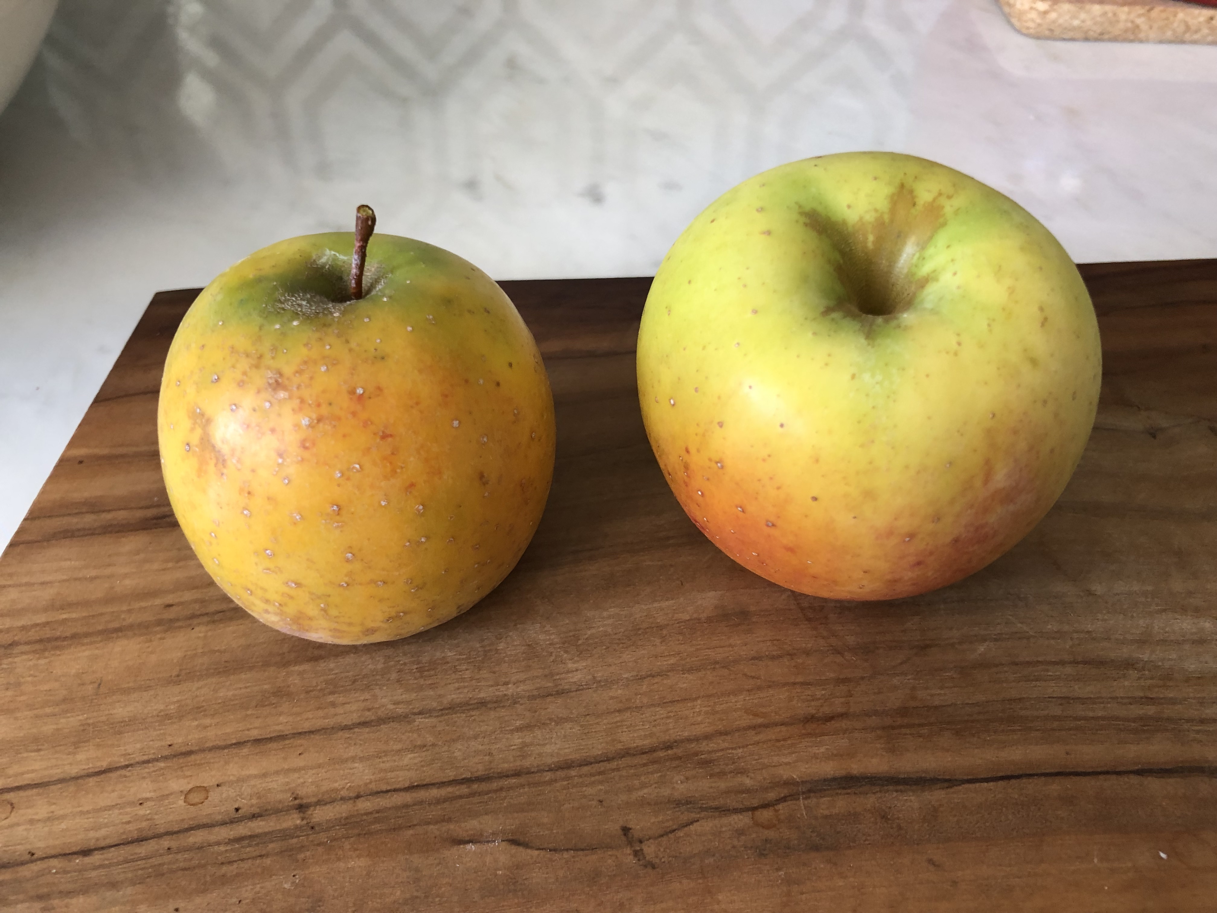 This Goldrush apple on the left fell off the tree yesterday. It’s smaller than the store bought one on the right, and a lot sweeter and more flavorful, but probably a little over ripe. Probably the right time to pick them here in northern Florida is October.