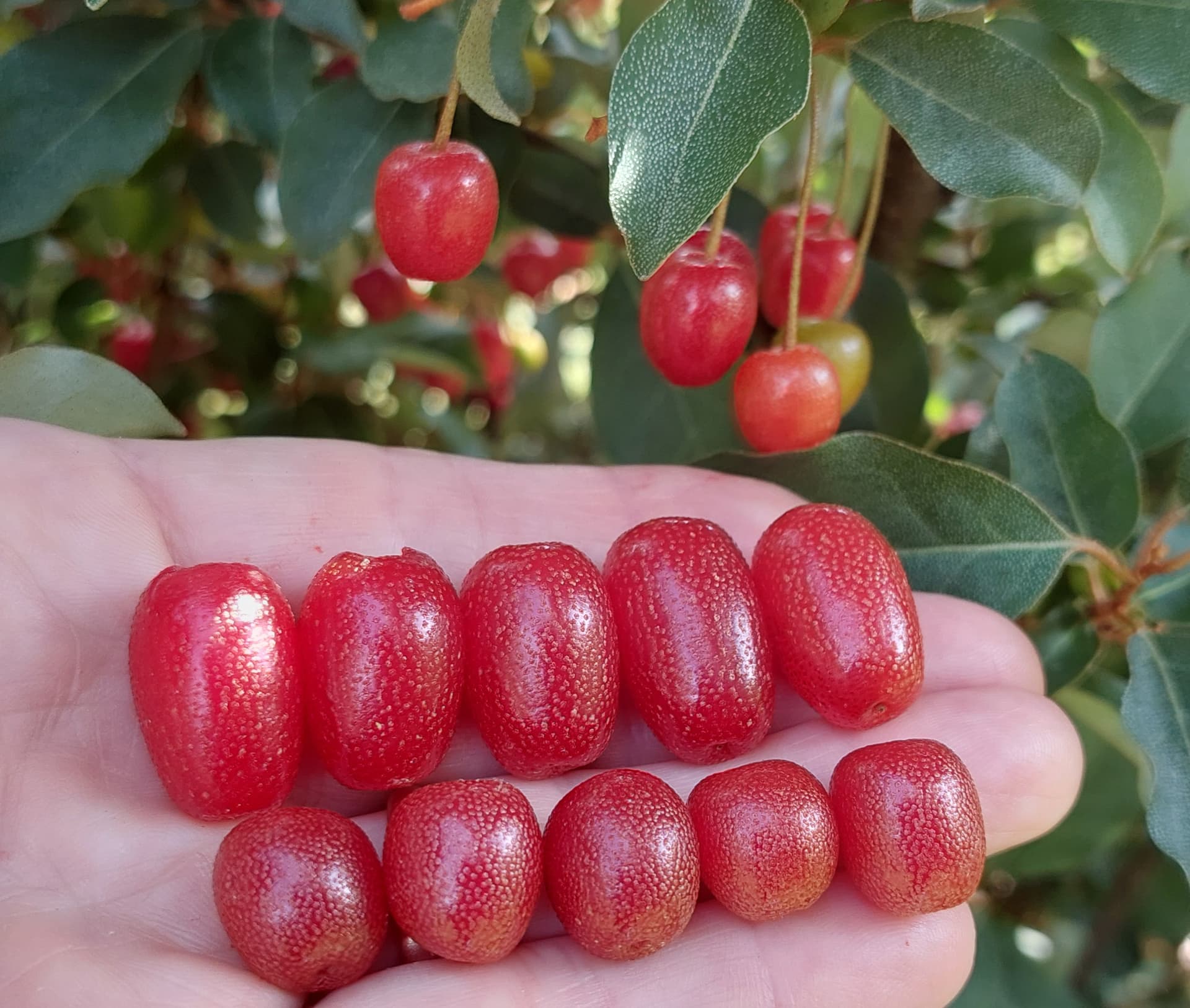 My sweet scarlet bush… starts ripening berries 2-3 weeks later than my RG… and about a week later than Carmine. They are by far my smallest goumi berries.