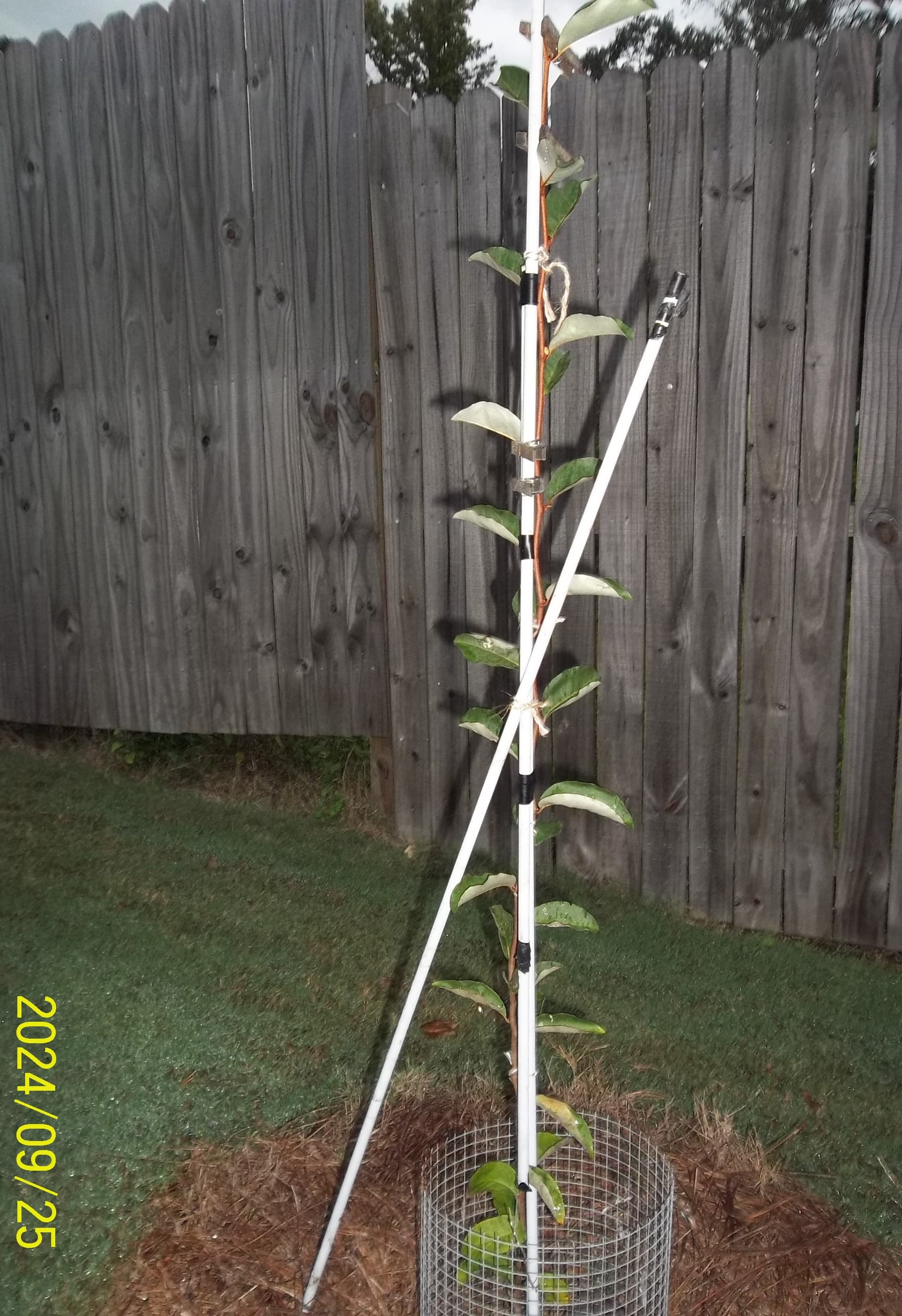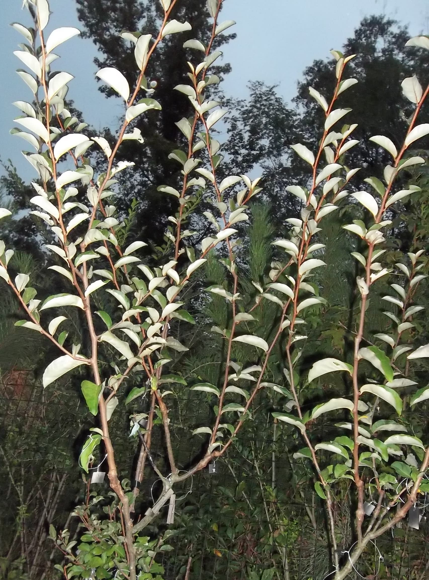 This is a Tillamook/Carmine graft onto a slightly bigger than a toothpick root in 2024. It grew straight up and is now about 4.5’ high. Probably going to grow it into a small tree form.