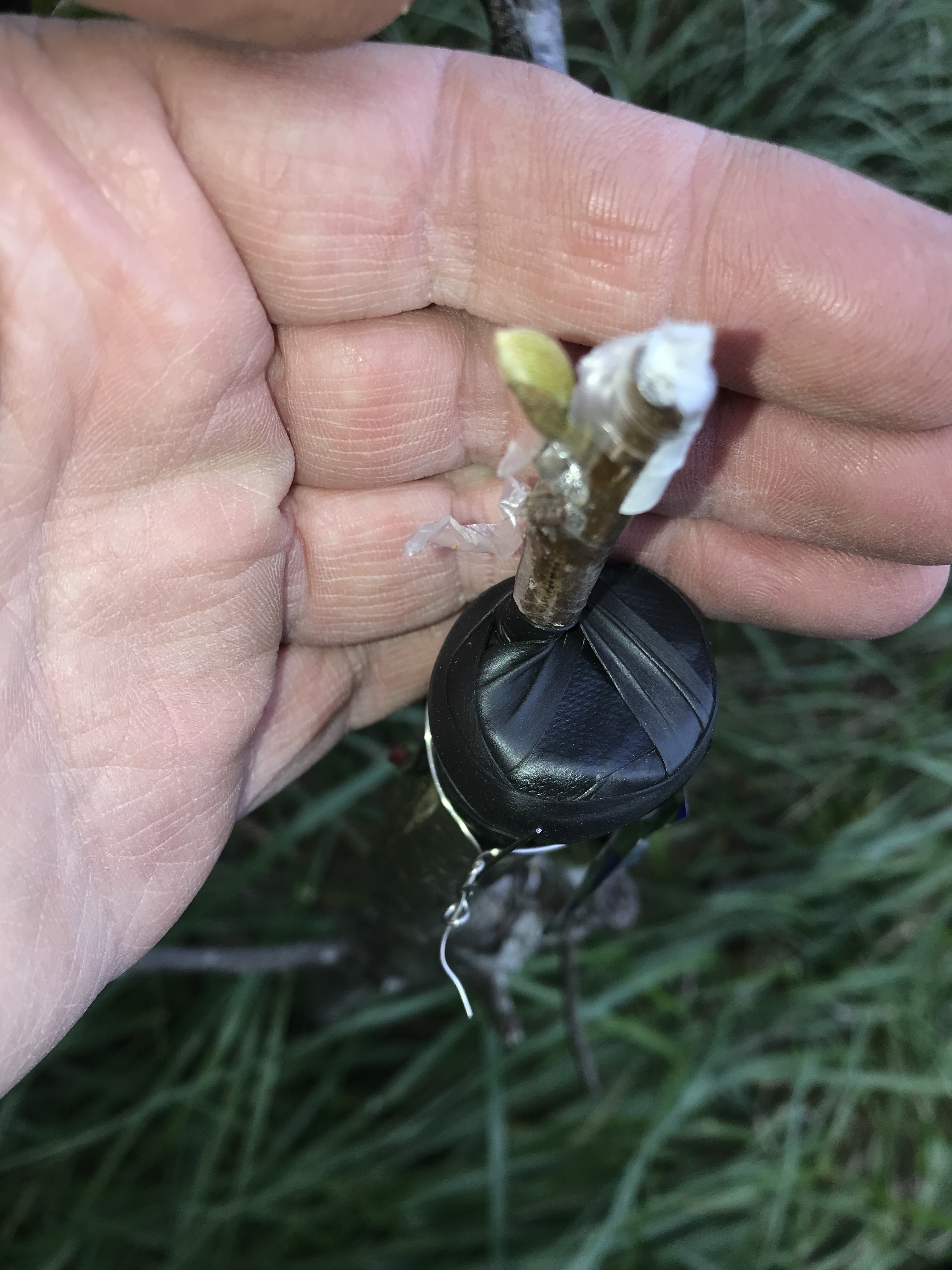 I made 2 grafts and it looks like the second one is just starting to push as well, but it was a little behind. Both are wrapped tight with parafilm. I’m not sure if the bleeding cuts helped, but they definitely bled. One of the grafts dripped fluid out of the graft union despite the electrical tape and parafilm which I thought might cause a problem, but it looks like it may be ok. Neither of mine pushed sap out the tip, but I agree that that sounds like a good sign. Also, I found the kiwi wood to be the easiest wood to make nice flat cuts on of the grafts I’ve made so far… it was fun to have nicer looking unions than I’m used to making😄