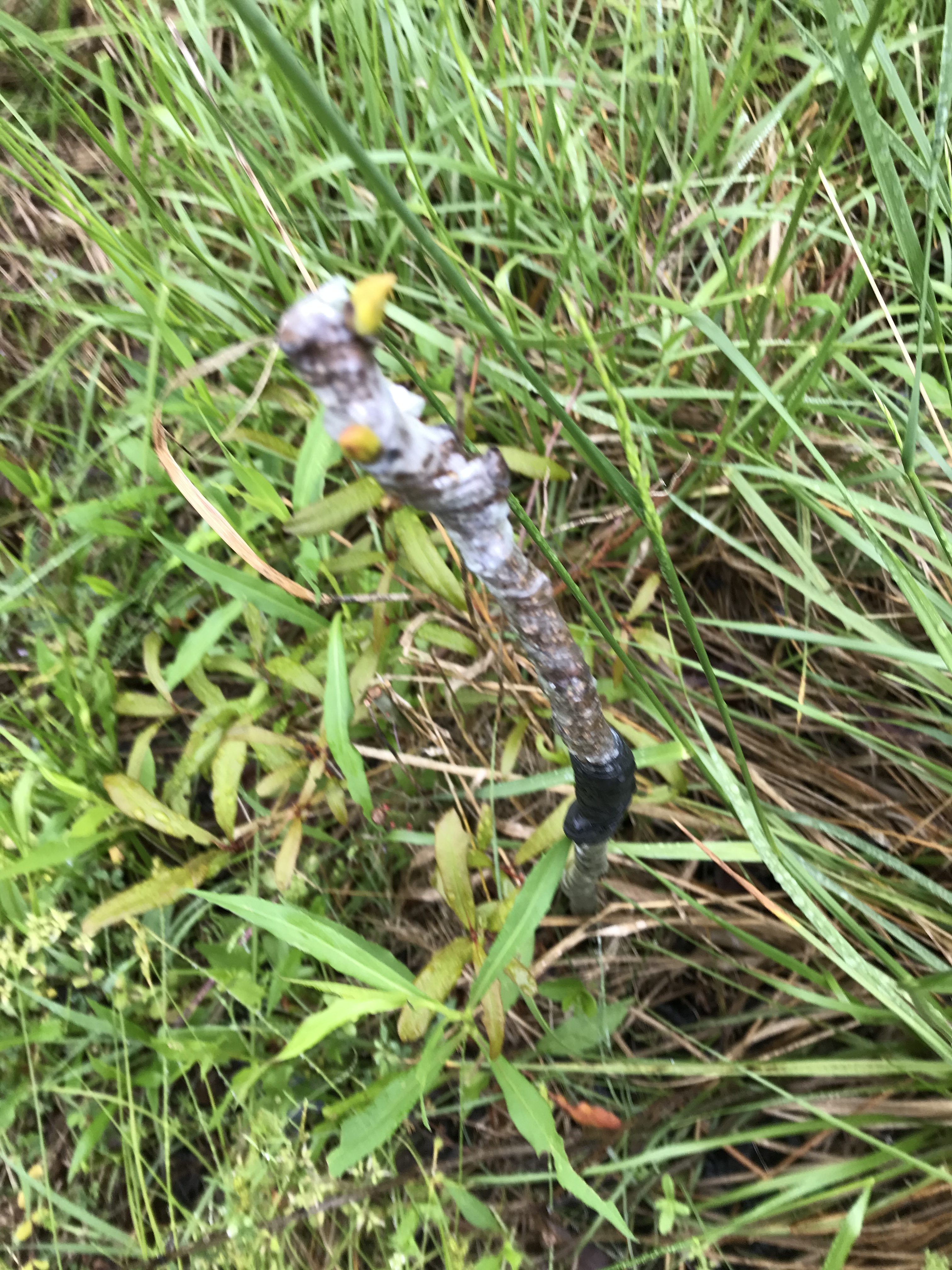 The unwrapped one is pushing, and I feel good that its connected, because it was dripping clear liquid from the tip of the scion a week after grafting.