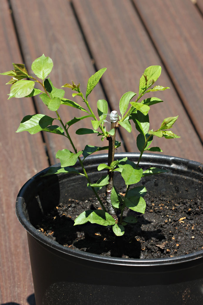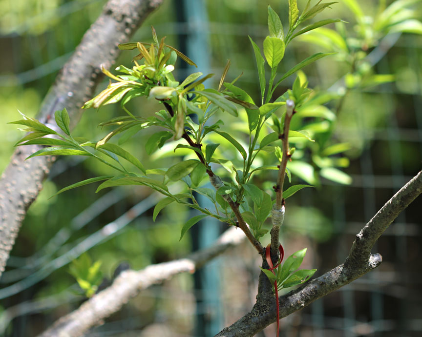 When you guys cut off your in-ground rootstocks there are branches you strip the side shoots off of and leaves and tie it to the rootstock with electrical tape. It’s free, it’s there, convenient, and you’ll make a tree.