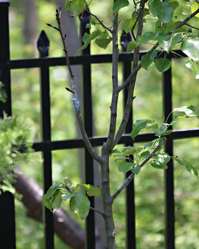 Surprise pear graft: Ayers and Keiffer on ornamental flowering pear. I made this graft on a whim after pruning and forgot about it until I came across it again with the Ayers leafed. I now plan to convert this entire tree to fruiting varieties.