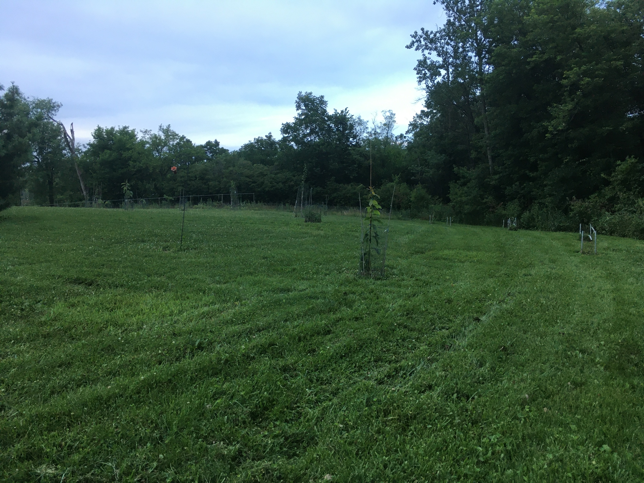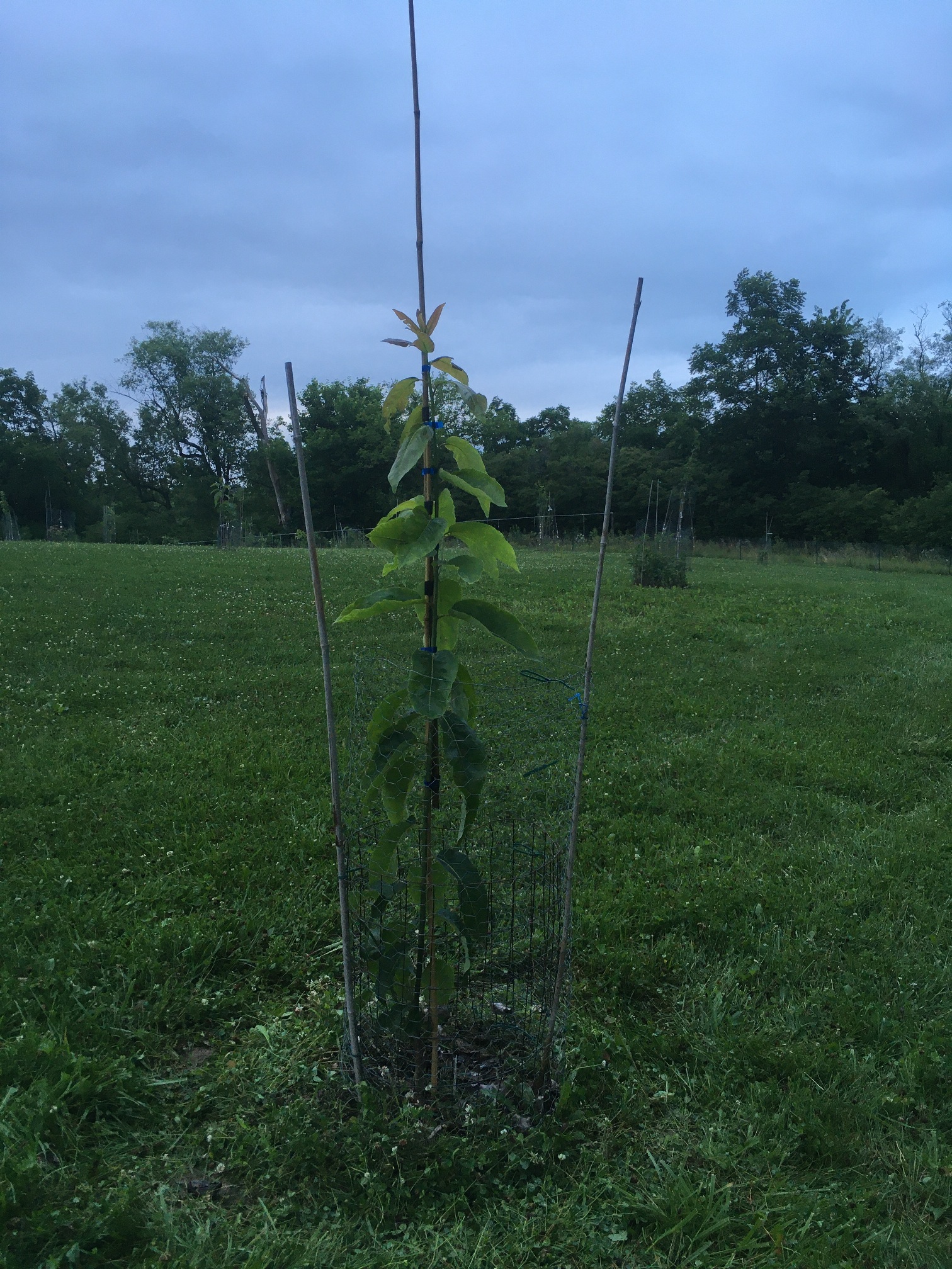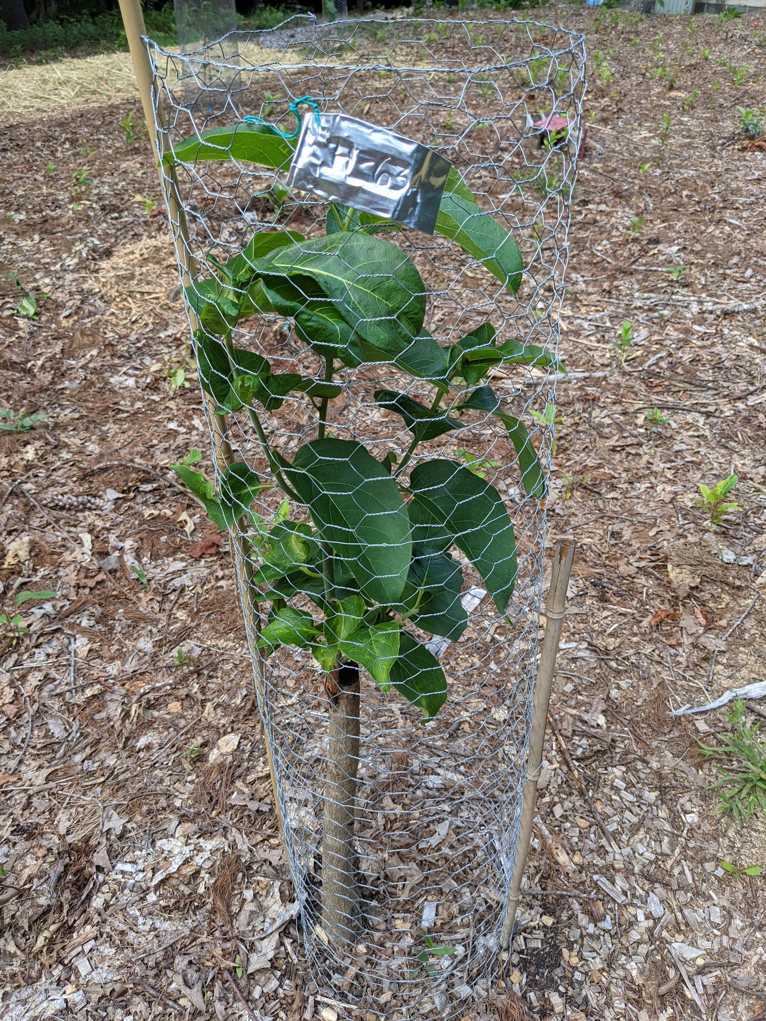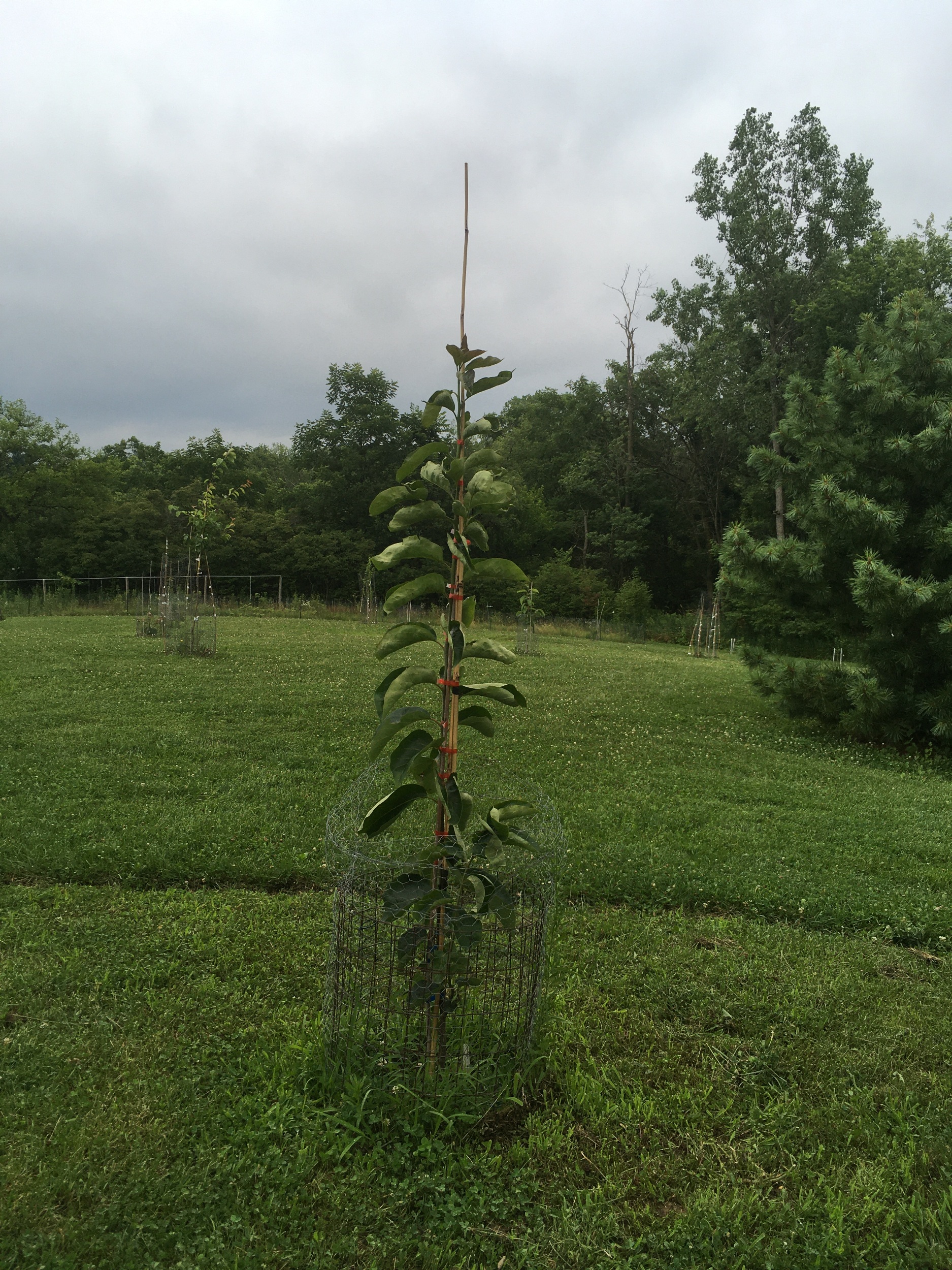 Those two stakes I’ll use to wrap around more poultry fencing before winter this year. I’ll grow it as a single trunk up to above deer browse (5’ to 6’ or 2-meters) and then begin the branching for each tree’s future on my property.