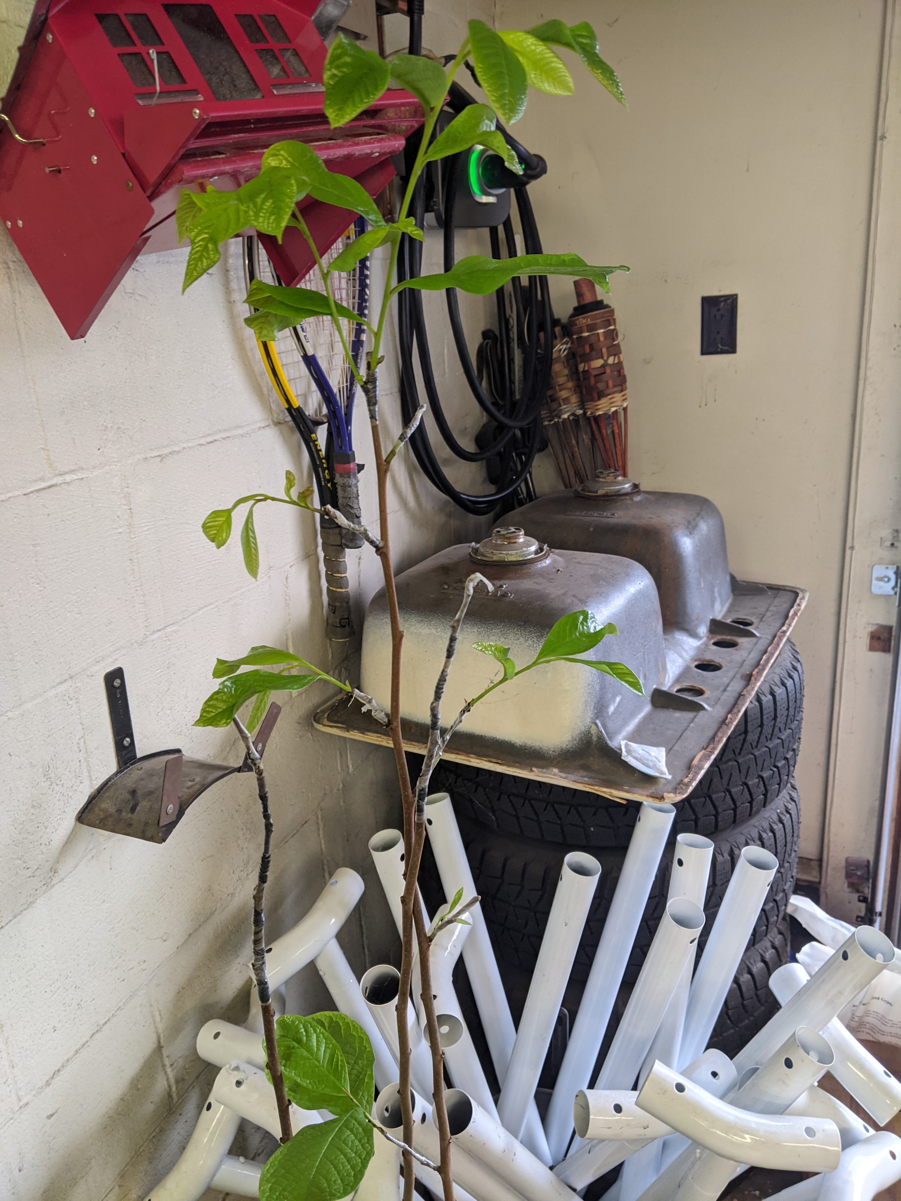 The two shoots at the bottom are adventitious shoots that arose. I let them grow for biomass and one I left/let to grow to about 15-18" for scionwood, next-year.