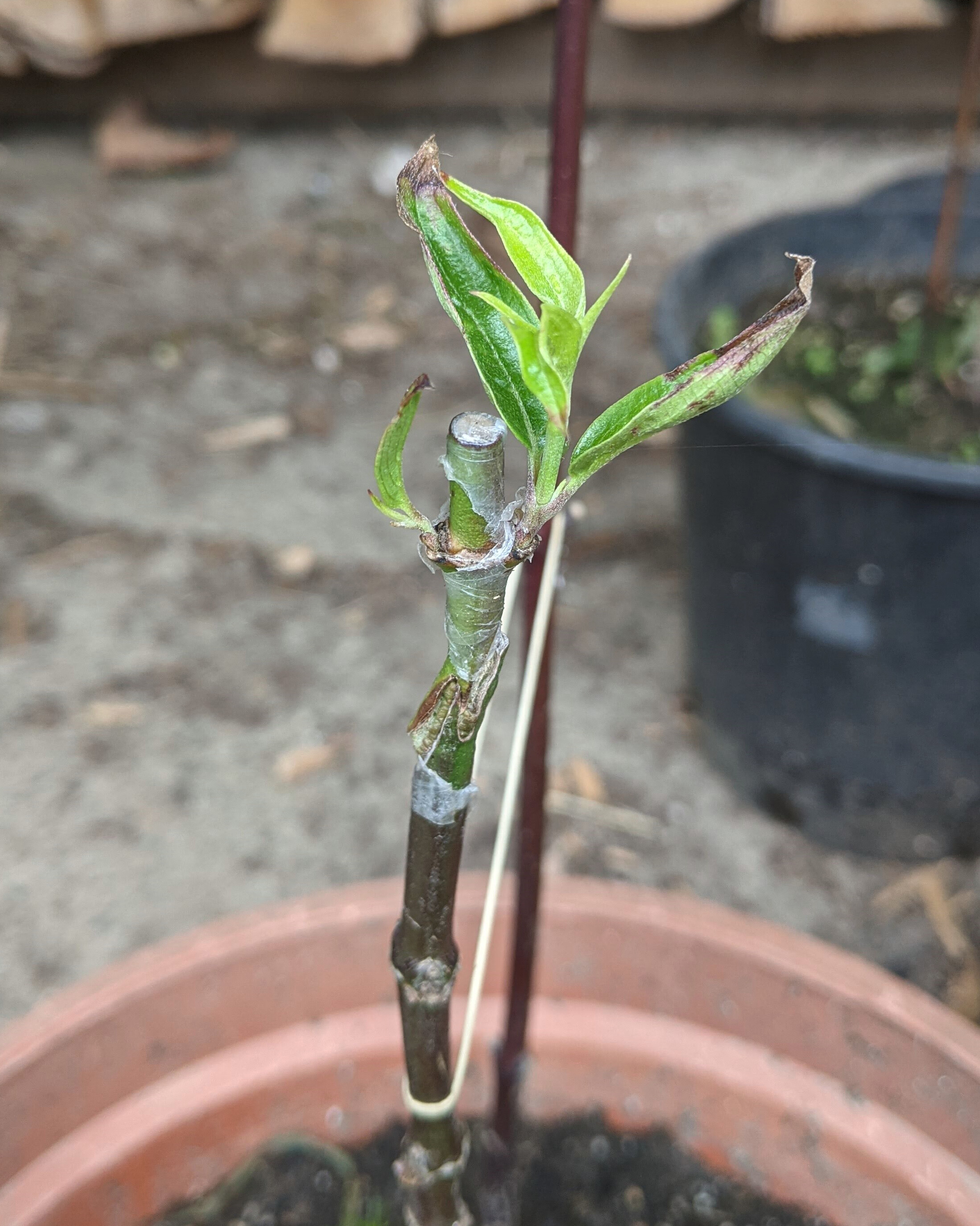 The other scion just now having began to show life, 2/3’s of it was cut off to leave that single bud that is now pushing/growing.