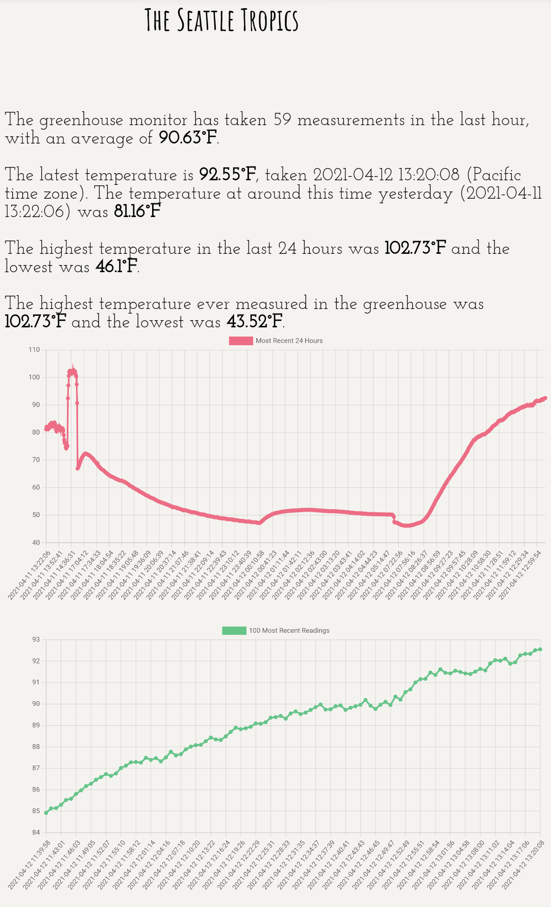 As I mentioned above, I didn’t open any doors or windows other than for brief moments today, with an outside high of 62°F and entirely clear skies it plateaued in the greenhouse around 93°F and has begun to drop: