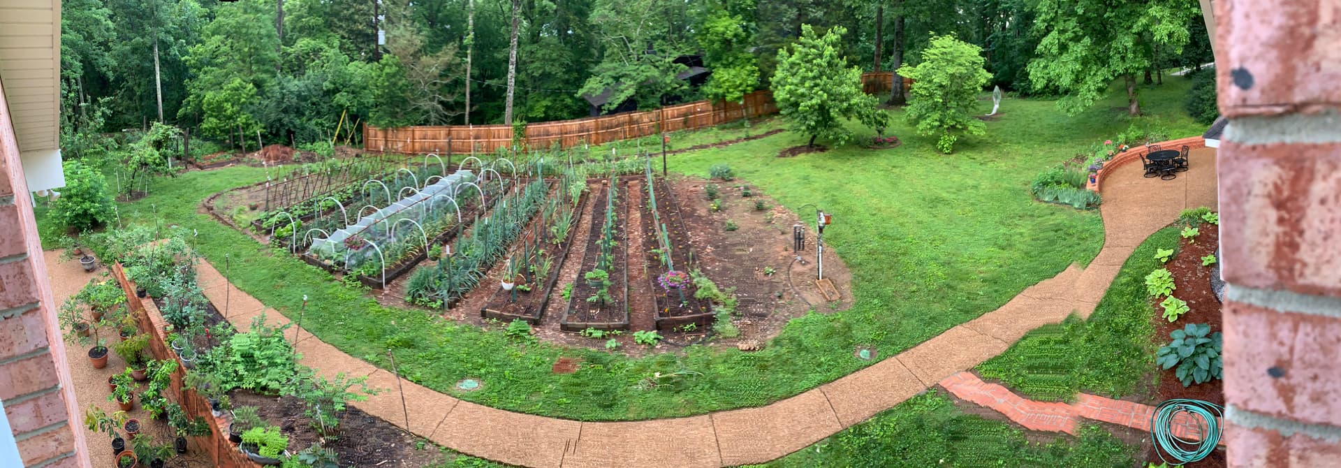 Yes, Winn. I realized that my response was to one that was a few years old. Just like you, I went through a few machinations with the water supply to my various needs locations about ten years ago. While the rain barrels are a great idea for stop gap watering they do tend to run out of water when we’re still in need. I finally hired out a local guy who extended our main trunk out into the front and back yard and he put in an anti flowback valve and a timing unit and we were finally fixed for water in the gardens. Best thing I ever did for my garden was to automate the delivery of just enough water to keep the garden going in the heat of summer. This photo is a panoramic view of the garden at our home in Nashville. Look closely at the boxes to see the half inch emitter hoses going up into the individual boxes.