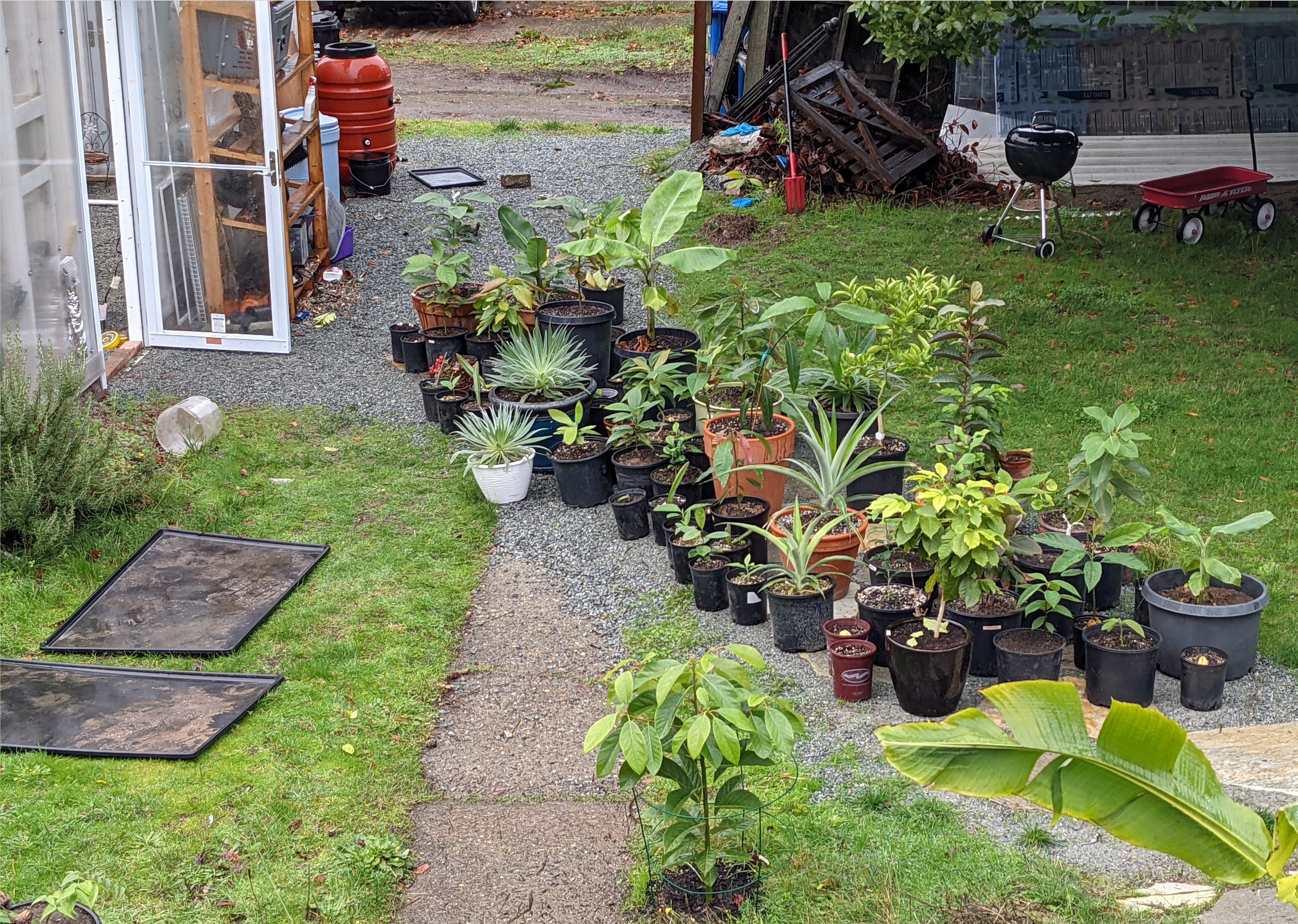 The distance from the nearest water spigot means I have to haul an enormous hose across the yard when the rain barrels run dry in summer. In general, I think it would have been better to run a water line out and include some kind of expandable automated irrigation system. Watering is a chore and my various attempts to add pumps on timers to the rain barrels have mostly failed.