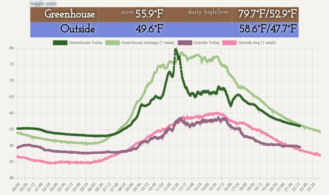 Sorry to dredge up this old post, but I’m thinking of switching from a Thermocube to something like that Peco unit. Mostly my issue is on cool/overcast days like today, the 78/60 Thermocube keeps the exhaust fan running and doesn’t let the greenhouse warm to what would be a very reasonable low-80s temperature. Sometimes I manually override it, but here’s what it looks like when I forget to do that on an overcast spring day: