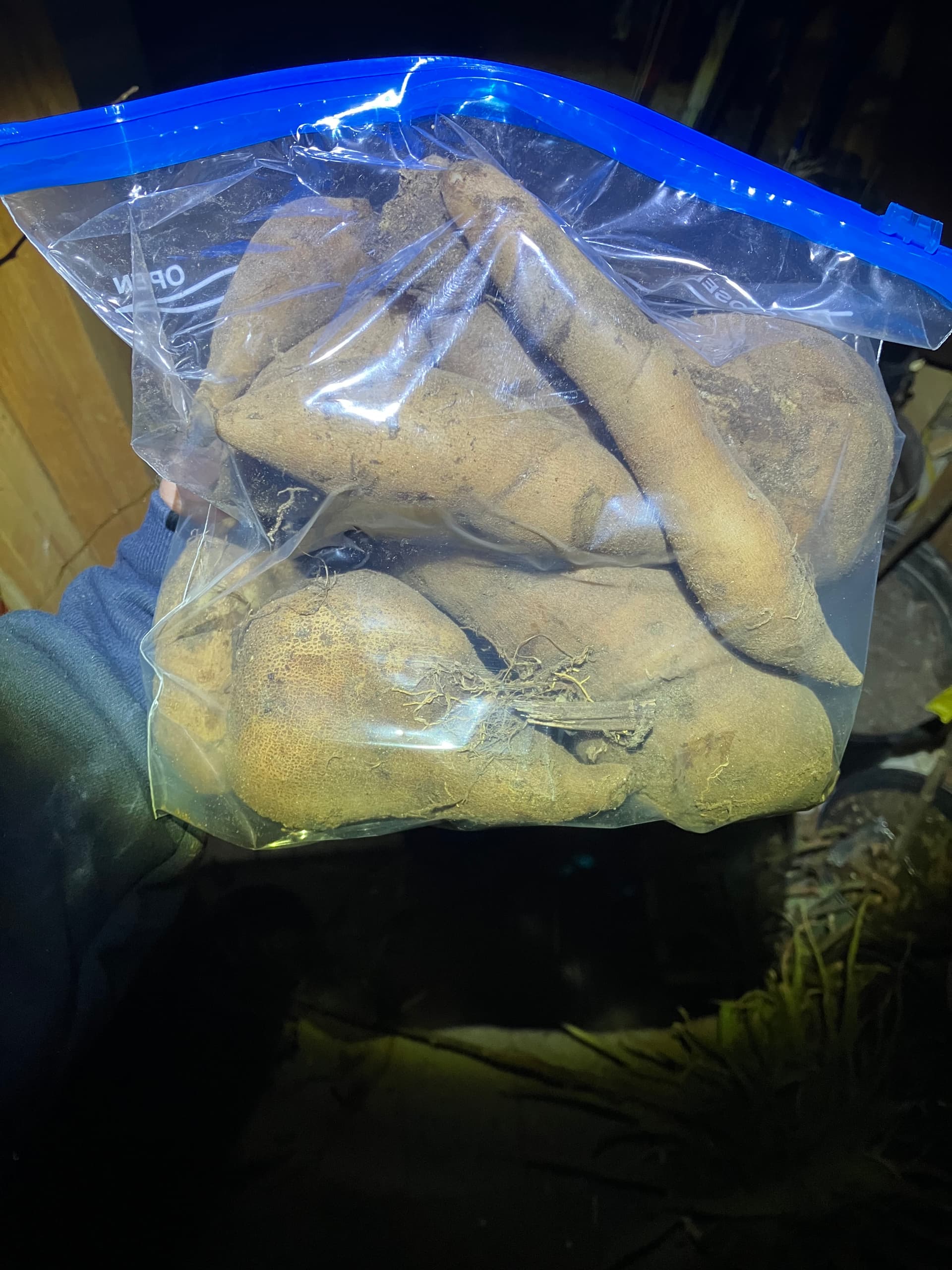 Thats a one gallon freezer bag btw, full from that yacon that I stuck in the pot with a big seedling citrus. There was one enormous tuber that I couldn’t get out. It was too wedged in there and kept snapping into bits. Ive seen tubers 1 ft long. They’re probably~ 3 lbs at that size.