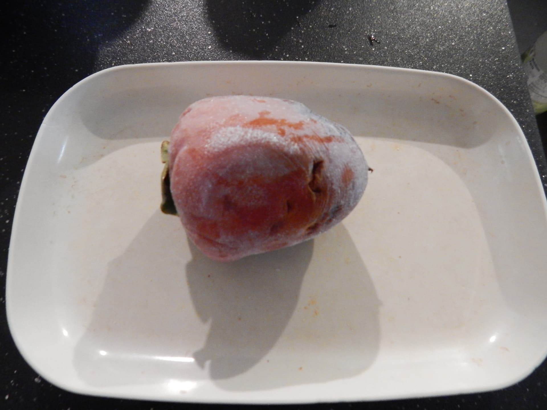 The picture is from the “good” (non-astringent, seeded) tree. That tree is probably at least 30 years old so that may limit or define what it could be. The persimmon was just taken out of the freezer. It has lost some shape due to being “mush” before it was frozen.
