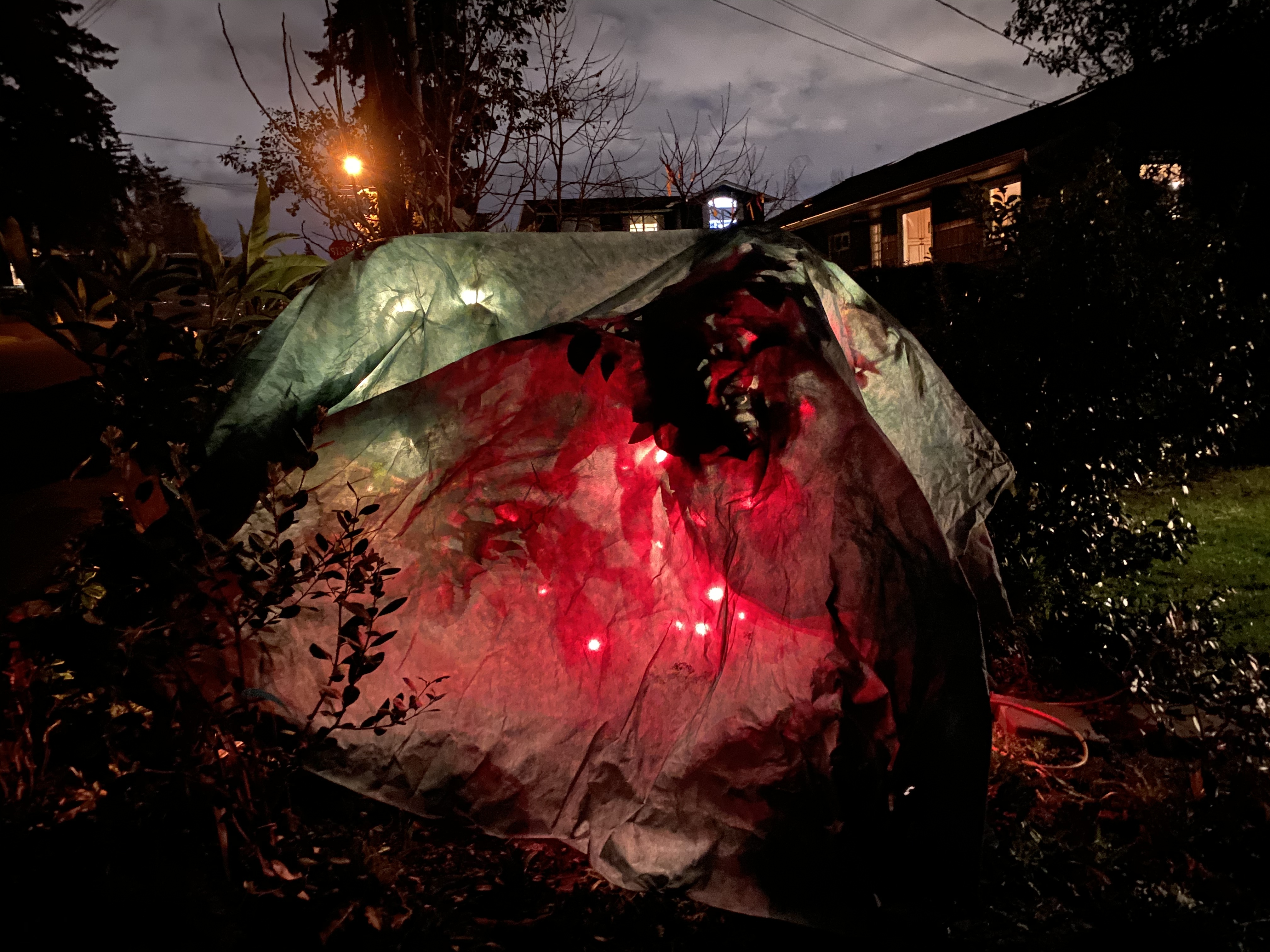 String lights are pretty low risk I would think, but some people use heat lamps and that could go wrong more easily if combined with blankets or tarps
