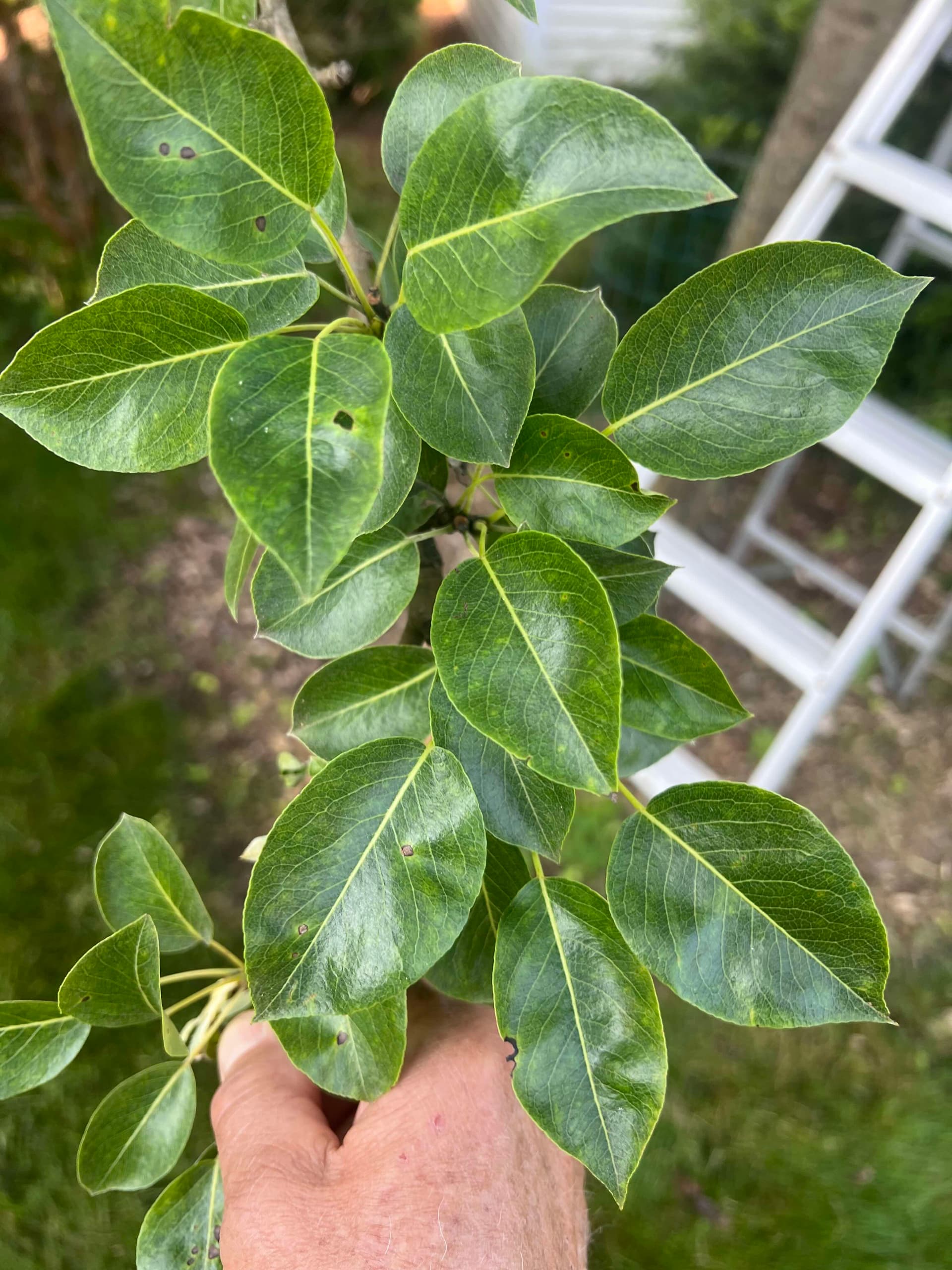 Frustrated, I pulled up this thread and noticed the foliage in various pictures. What was apparent to me immediately was that the leaves on my âHarrow Sweetâ are not even slightly serrated, whereas the leaves in these pictures are visibly serrated. It seems that the leaves on my tree are also shorter than the leaves on pictured Harrow Sweet (see picture below). So Iâm leaning to the conclusion that Iâve grown a big OHxF 97 tree. FWIW, the branches emerging from the central leader are distinctively vertical, which Iâve read is characteristic of Harrow Sweet but also OHxF 97.