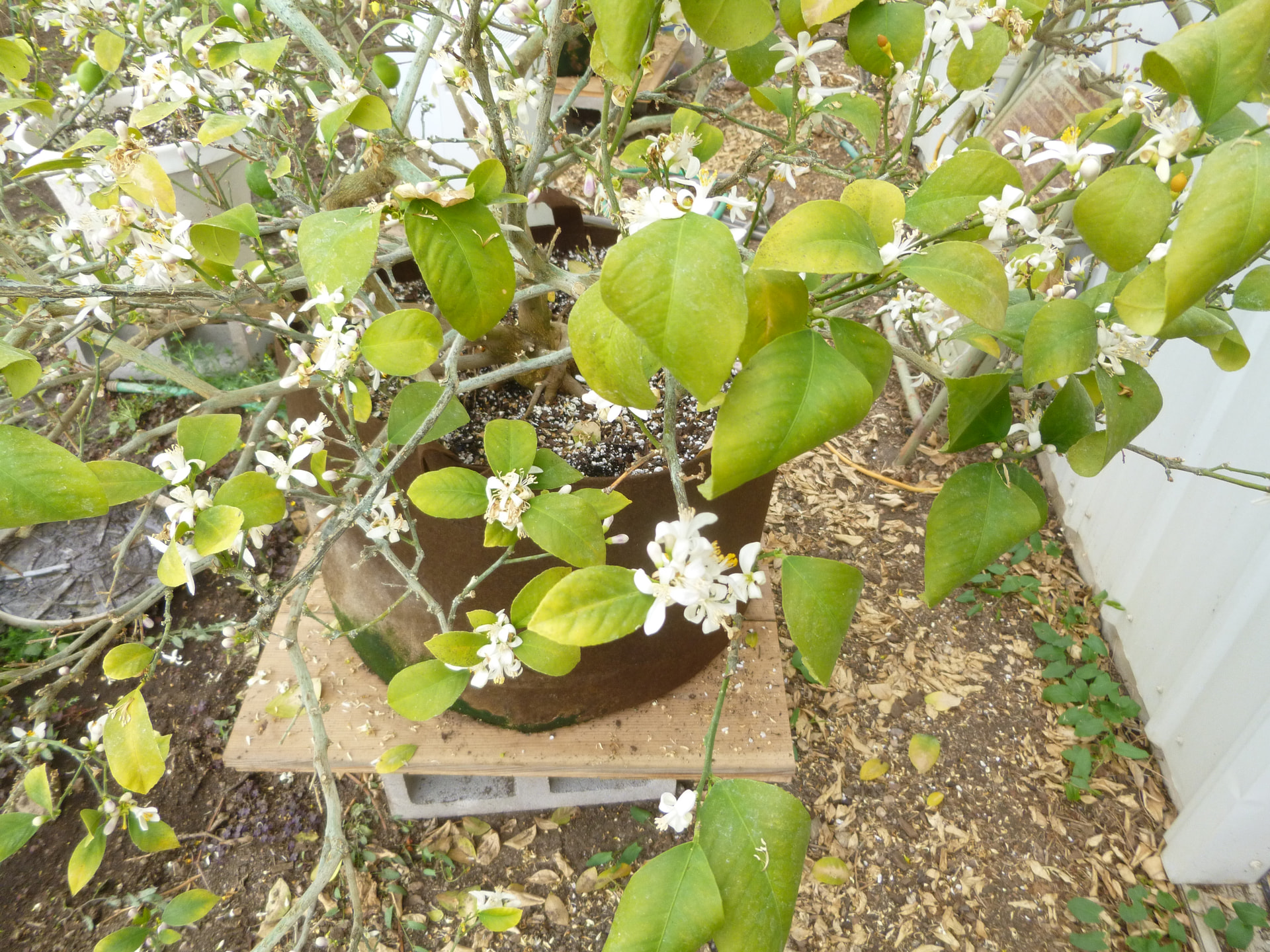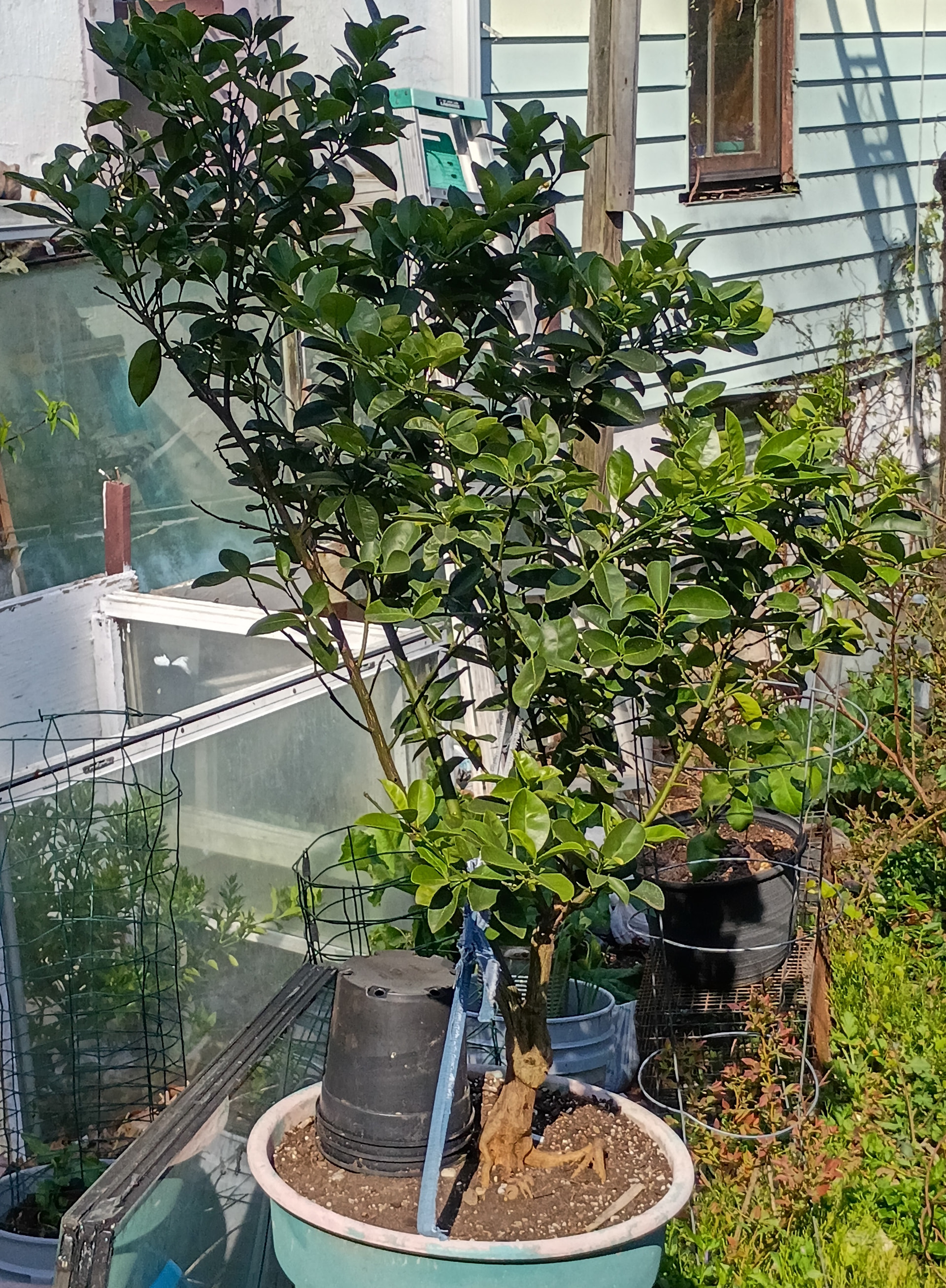 A few more details on the watering/soil thing. Back when xplanted these to bigger, fabric pots I teased out some outside roots from the old root ball but did not attempt to wash off all the old soil. So this old root ball (which was pretty full of roots) was just put into the new pot and surrounded with new 5-1-1 mix. Now when I test with the moisture meter, The 5-1-1 on the outside tends to dry out in a day or so, but the old root ball stays fairly moist. I have been watering only at the perimeter of the pot, thinking that the old root ball would dry out some, but that does not seem to be happening.