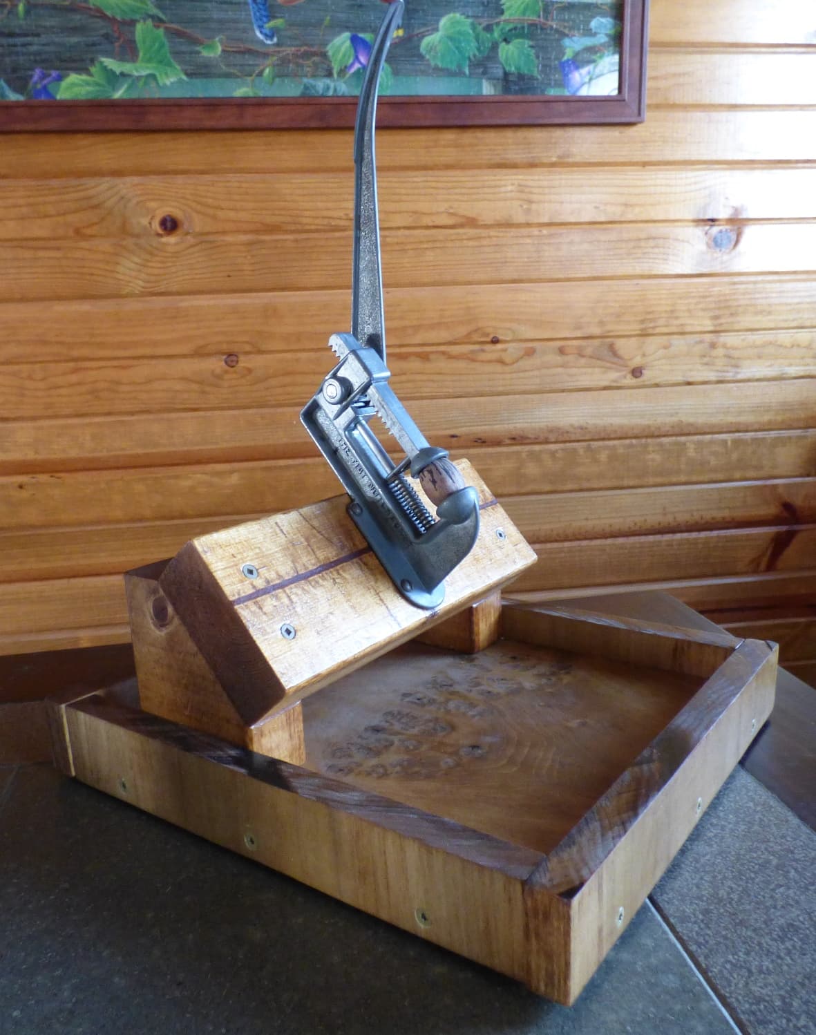 A good friend gave me an older Grandpa’s Goodie Getter he bought years ago at an auction. The auctioneer didn’t know what it was. My friend didn’t either, but he bought it for $5. I cleaned it up a little and regreased the cam and proper contact points. I put it on a board of persimmon wood. It came with a small nut ram as well, and I bought a pair of shears from GGG. The newer models of GGG have changed a few things, one of which is a beefed up handle from what I’ve read. The model I have the handle does feel weaker than my King Kracker’s handle, but the GGG does have more mechanical advantage on its side. I’m looking forward to giving it a really big test run this fall.