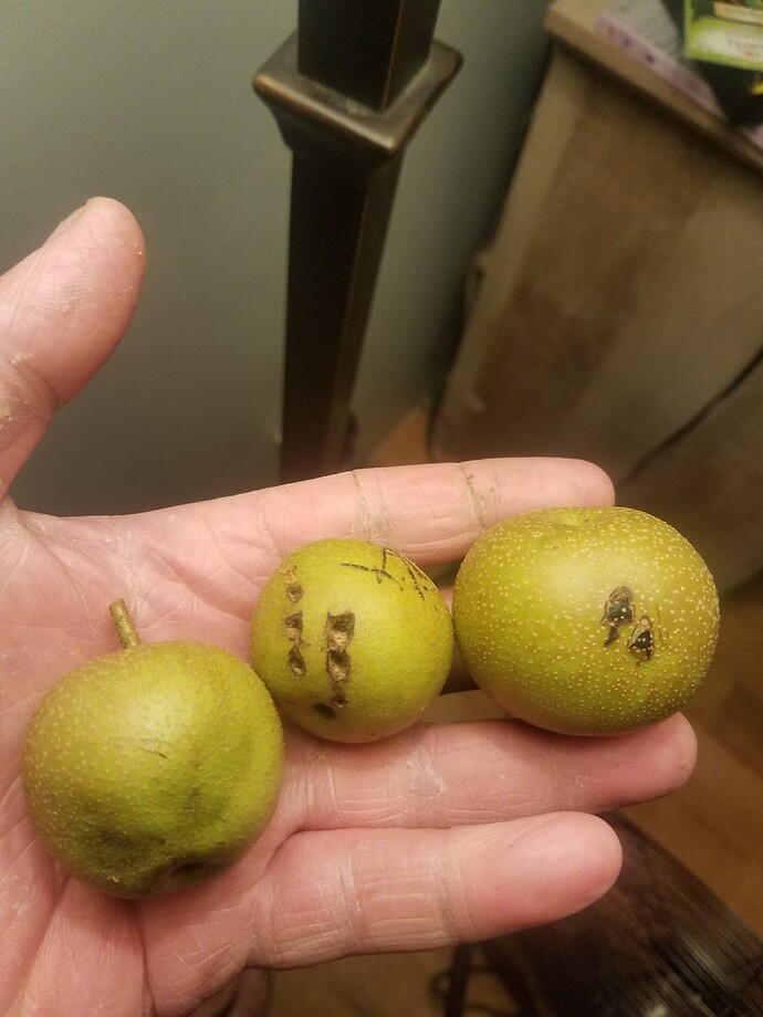 This link will help to identify common diseases http://extension.psu.edu/plants/gardening/fphg/pome/diseases/photos. I do not suspect it’s one of those diseases but rather likely it was bacterial blossom blast http://www.ipm.msu.edu/diseases/bacterial_blossom_blast. That blossom blast claims some fruitlets early on or water and nutrient conditions can present those symptoms as well and have nothing to do with a disease. Fireblight can present shriveled fruitlets but rarely does. The two aforementioned diseases are bacterial diseases managed by a copper spray in the early spring prior to fruit set. Disease typically impacts leaves around the mummified fruitlets whereas nutrition or h20 requirements typically do not. Don’t overlook pollination issues if the pears are small and it’s early in the season when fruitlets drop or shrivel up. Here is a link with a few of the pear pests out there http://www.ct.gov/caes/cwp/view.asp?a=2823&q=377866. Here is a link with additional diseases http://extension.uga.edu/publications/detail.cfm?number=B1336#Apples. Do any orchard maintenance needed eg. Removed mummified fruitlets and grass and diseased leaves if anyhave fallen below the trees. This link has great advice on maintenance mummified fruit Archives – Philadelphia Orchard Project . It’s not unusual to get some scarring on the outsides of fruit caused by feeding insects or birds. The fruit above that’s brown on the inside it looks like a pest opened up the fruit via a tunnel from the outside and the fruit spoiled inside. Coddling moth can do that later in the season for me.
