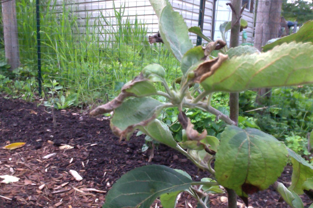 A couple of more details about our situation: the trees are on G41 planted in an area of former lawn that I’ve turned into a temporary “nursery.” They are currently top dressed with aged compost around the trees and mulched with wood chips spread over newspaper between rows. Next year I’m hoping to plant them out to start forming a Belgian fence along the perimeter of our yard and garden. According to the USDA soil survey, the soil type is Hinckley loamy sand, which is described as being sharply draining (especially in the subsoil) and moderately to strongly acidic.