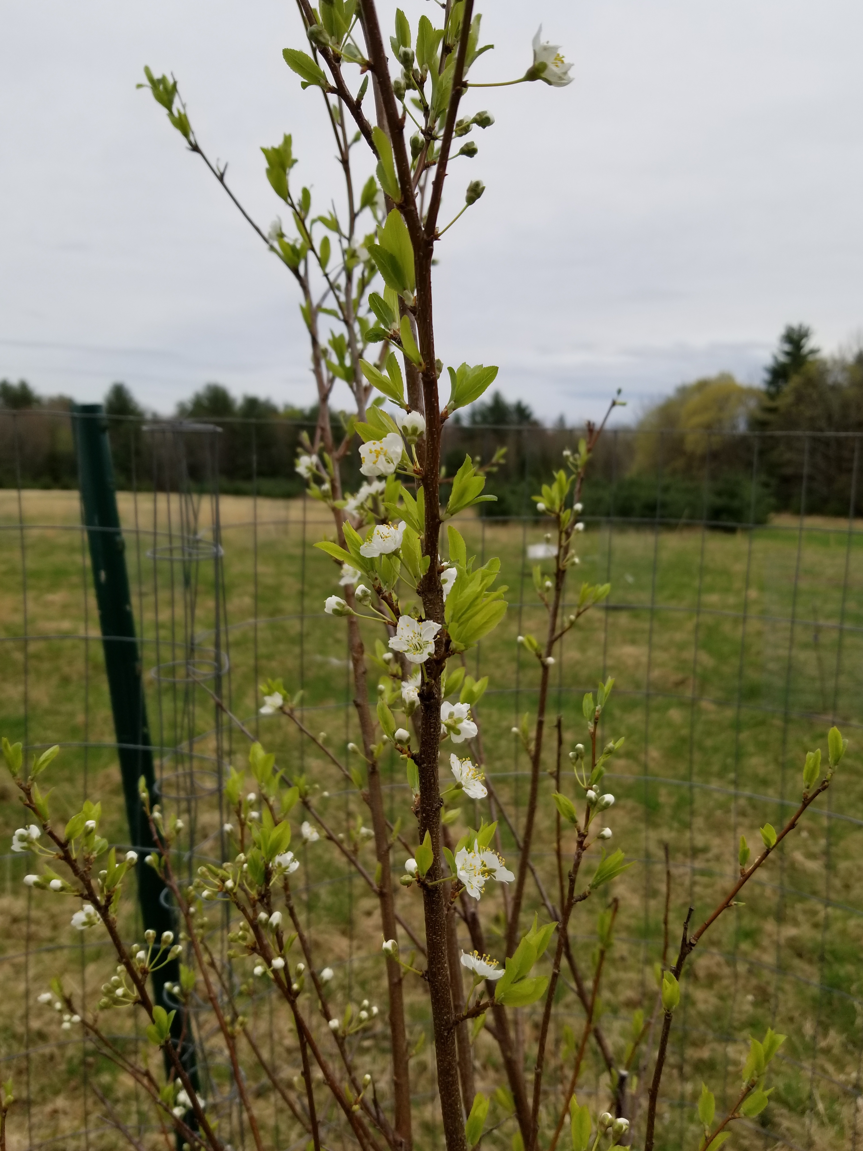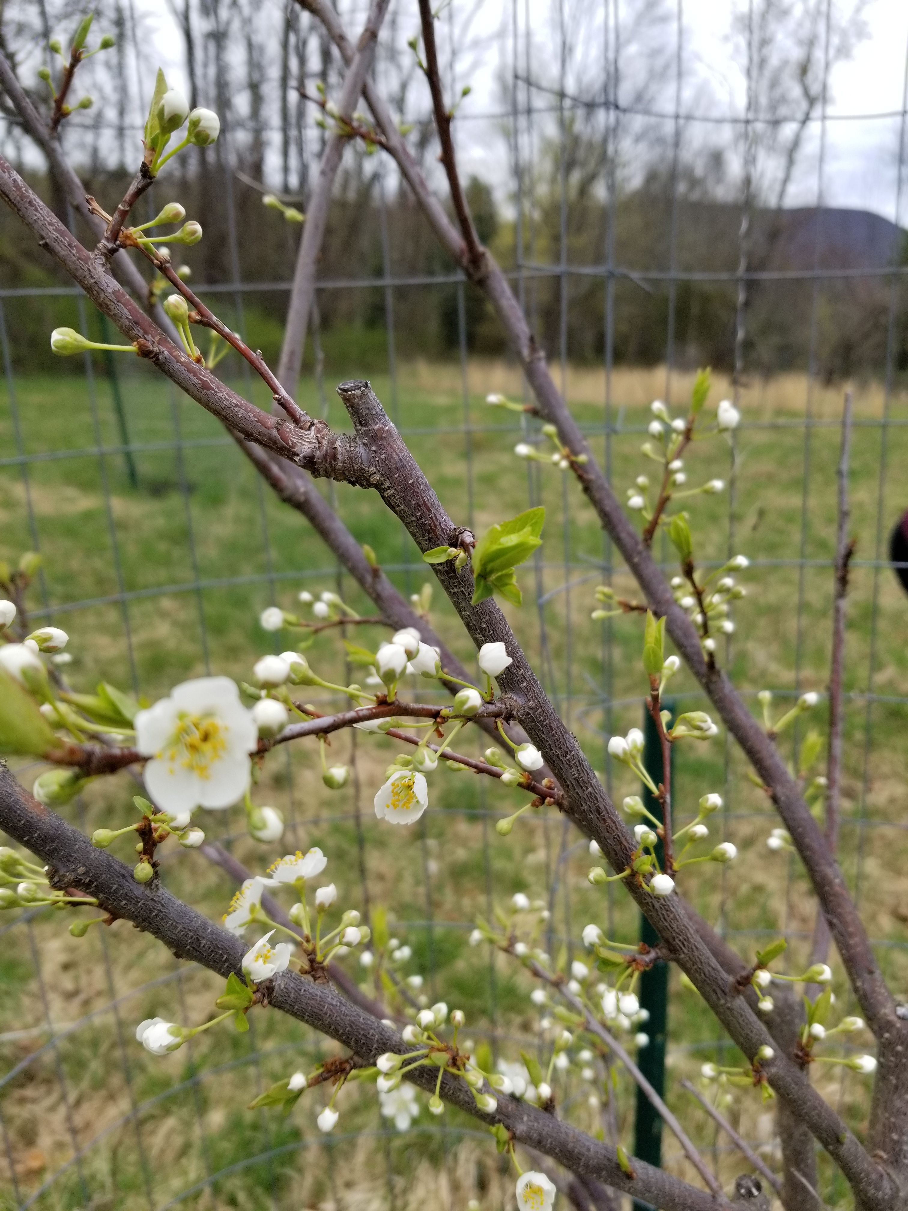 Once again, Surefire tart cherry is the last stone fruit tree to bloom for me. It is at popcorn stage right now, but none have bloomed yet. For reference, my Carmine Jewels are at 100% bloom. Peaches and Asian plums have already set some fruit. I got an ‘Ideal’ tart cherry graft from ARS that also has not bloomed yet, but seems a little farther along than Surefire. I’m looking forward to trying some ‘Ideal’ this year, it could be another winner for backyard growers. Hopefully we can hold off the frost the next two nights. Forecast lows range from 33 to 36 with clear skies……Hoping for the best.