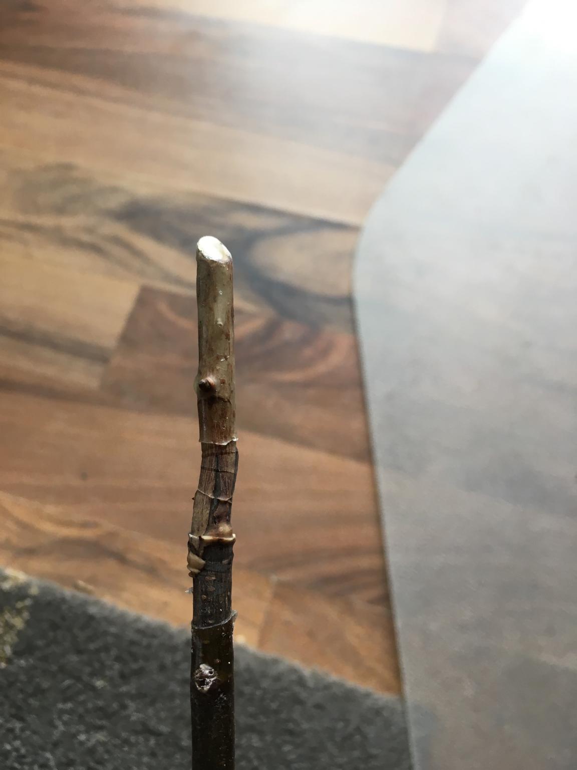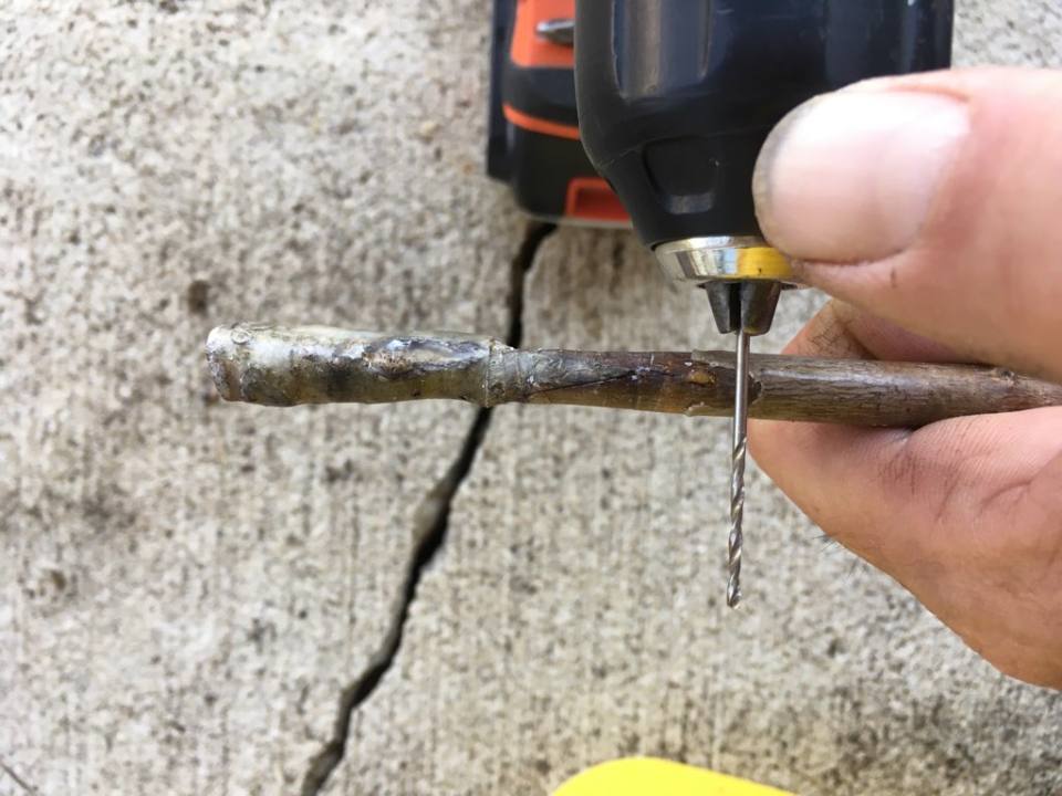 Here’s bleeding right from the fridge. It was/is bleeding thru the rubber band at the base of the V-shaped graft union… You can see it’s sunken. Well I wiped a blob of sap off and then thought to go get my camera because you guys are going to need to know what to do for each situation, so, here’s the remedy: (a) 1/16th in. bit below to make it bleed below the union and at least slow down the sap flow, a lot.