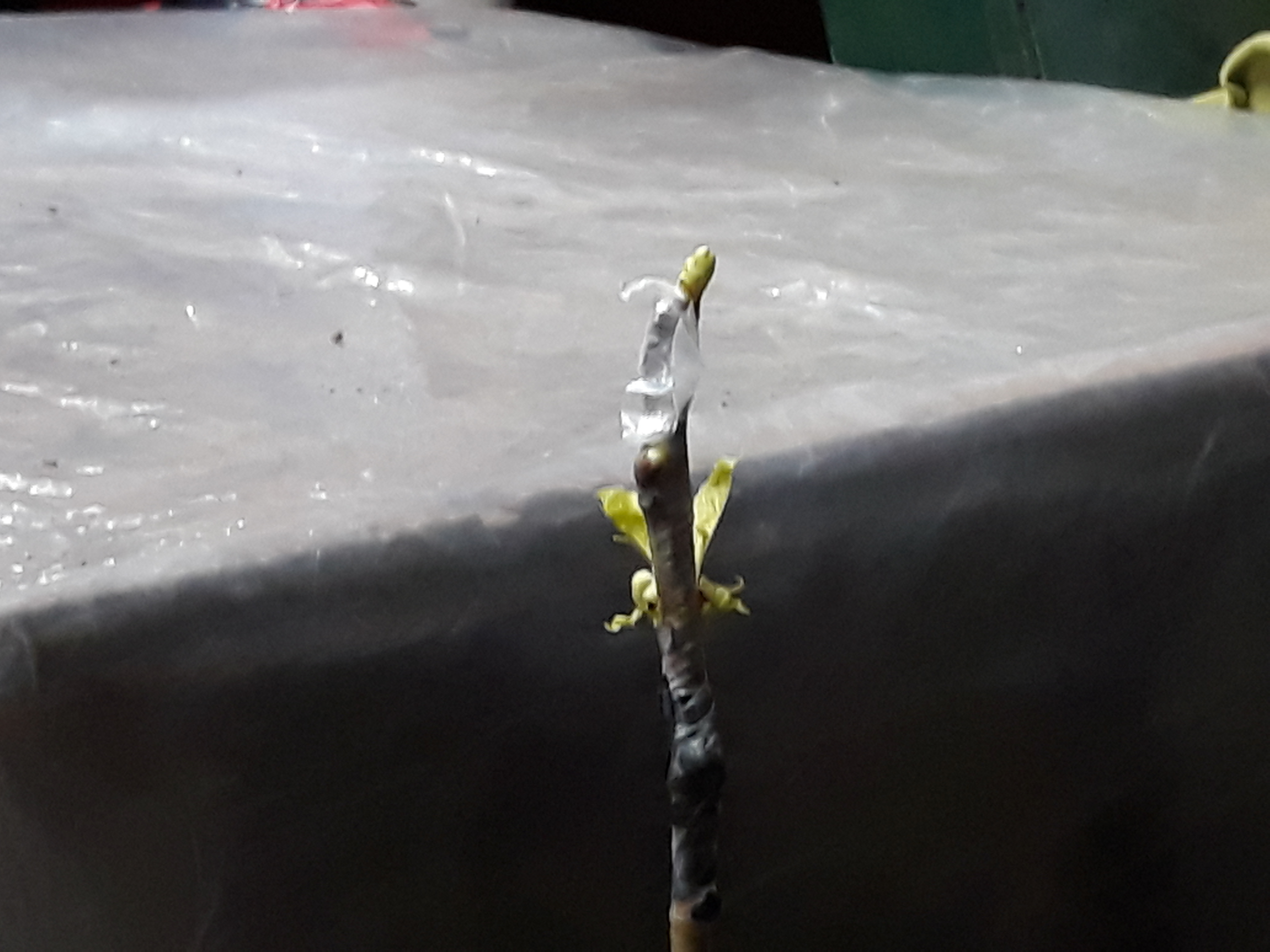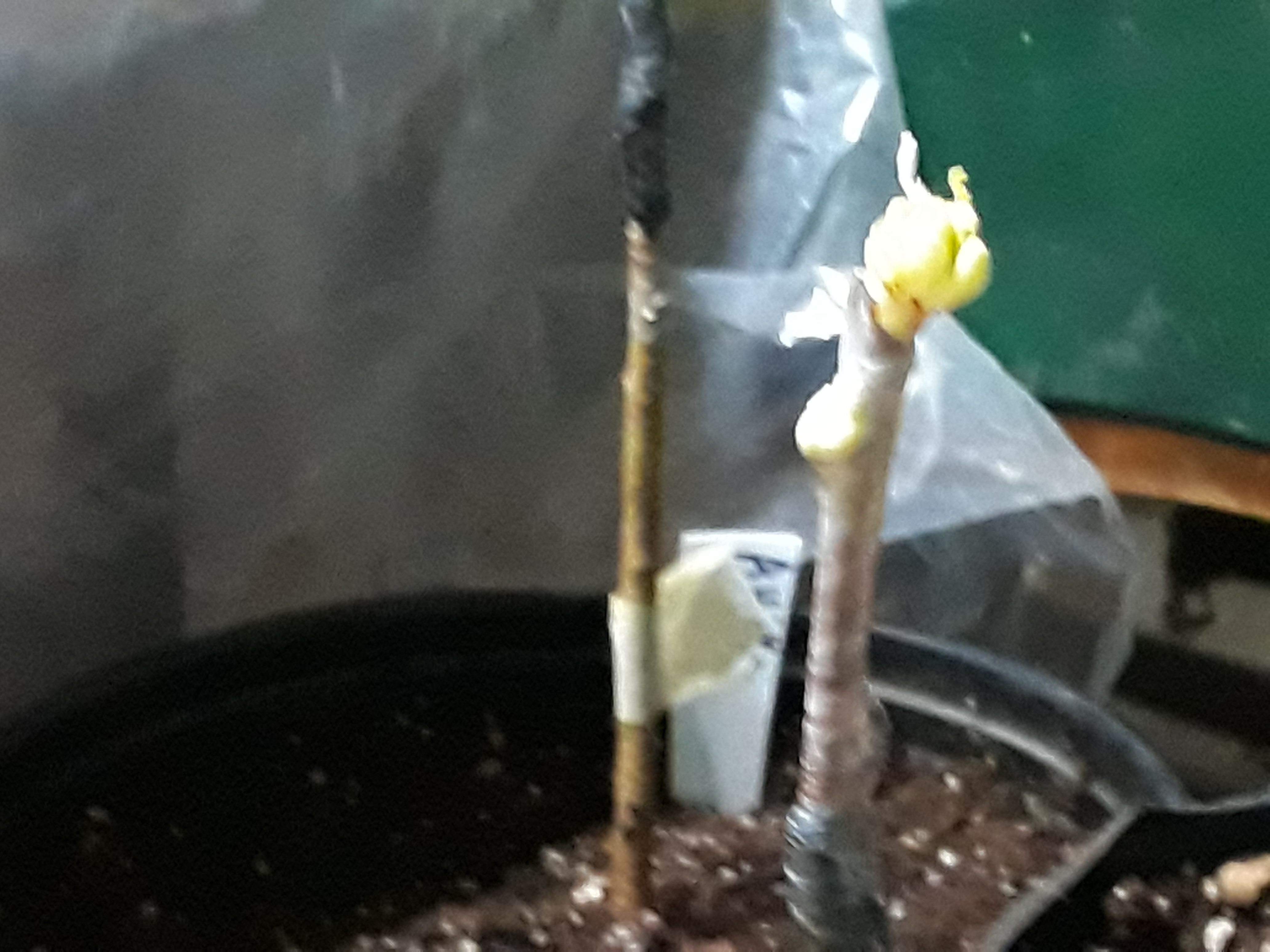 The apricots have swollen buds but no green growth. All of my grafts were wrapped with temflex and parafilm M - except for the first one, which has only parafilm. When I was checking the moisture of the rootstock, there was a small hole in the parafilm.