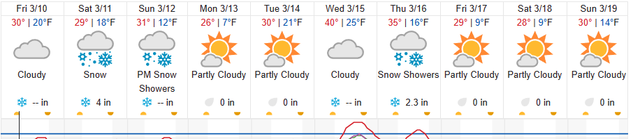 Been snowing on and off here since Friday. Maybe 6-8 inches total–the stuff last night was very sloppy. Maybe back into the 50Fs late week, but more cold coming after.
