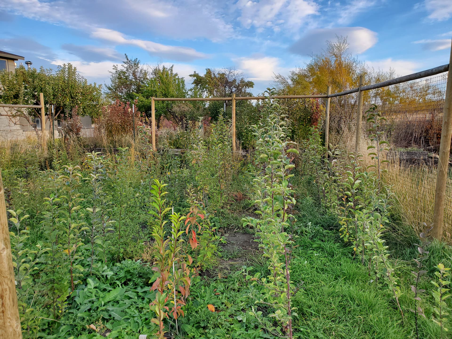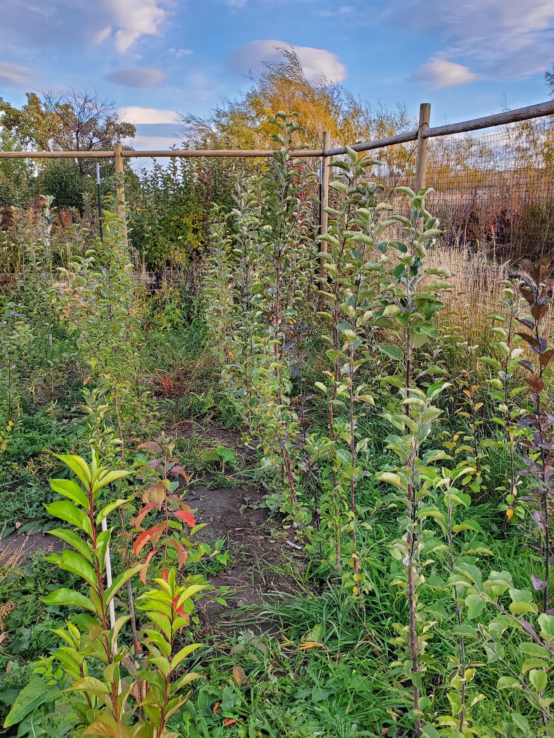 First things first, however, would be the timing of the digging. I read someplace most nurseries dig trees for bare rooting in early December, and so I am hoping I still have some time, but with 1 to 3 inches of snow expected in the next two days, and nightime temps following in the 20’s , I am wondering how long it will take the soil to freeze(?) Perhaps the snow will accummulate more quickly than thawing, and December will bring a foot or two of snow(?) In any case, the digging would be easier if the soil is dry-ish and not muddy. (I am only one guy.) The photos below taken just a couple days ago shows the leaves still green mostly, and not yet falling, though today the larger apple trees in the backyard have leaves turning yellow and dropping in the same day (and progressing quickly). So far, my plan is to just monitor the soil and test it daily. The longer the trees remain in the soil the better, I am sure, and so I will wait as long as practicable.