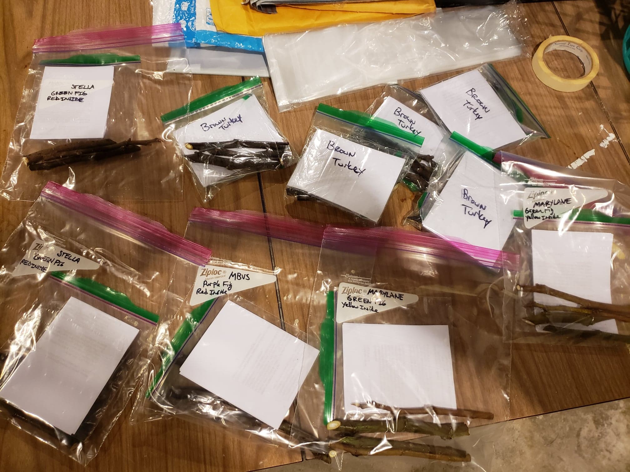 I have a ton of fig cuttings this year so I decided it would be fun to try to sell them through the farmstand. They’re mostly brown turkey and a few low value cultivars like Conadria or Marylane though I did throw a few nice ones in there too. My town has a large Italian-American population and is also home to the Cornell Agriculture Station so I’m not sure how well this would work elsewhere. The cuttings are within a smaller (lunch box sized) cooler within that larger cooler. When I’ve checked after a cold night there’s been a little condensation but no ice within the plastic packs. So far I’ve sold probably 15 or so sets–I include a simple set of rooting instructions with each. Here’s how it looks today.