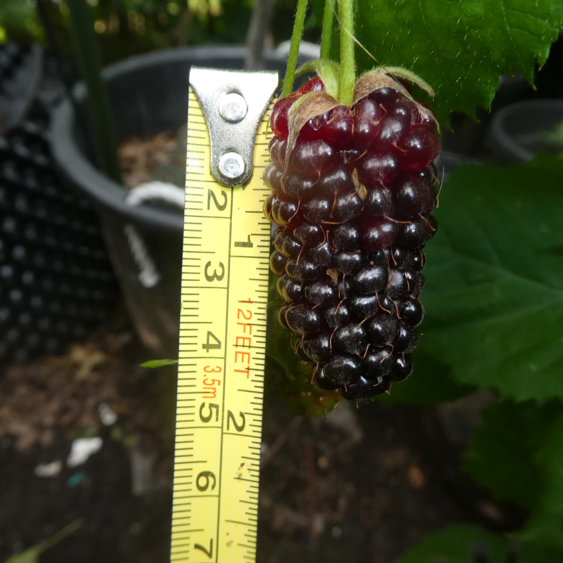 Based on its size (well over 2 inches long) and the shape of the fruit, Columbia Giant is a very likely match. Columbia Giant is known for producing huge, elongated blackberries that can reach or exceed 2 inches, which matches what you’re seeing. Galaxy and Big Daddy both produce large berries too, but they usually don’t get quite as long or slender as Columbia Giant’s trademark giant, elongated fruit. Galaxy tends to have rounder, slightly shorter berries, and Big Daddy’s fruit is typically big but more uniformly conical. So unless you see different fruit shapes on new canes, it’s a good bet your plant is Columbia Giant.