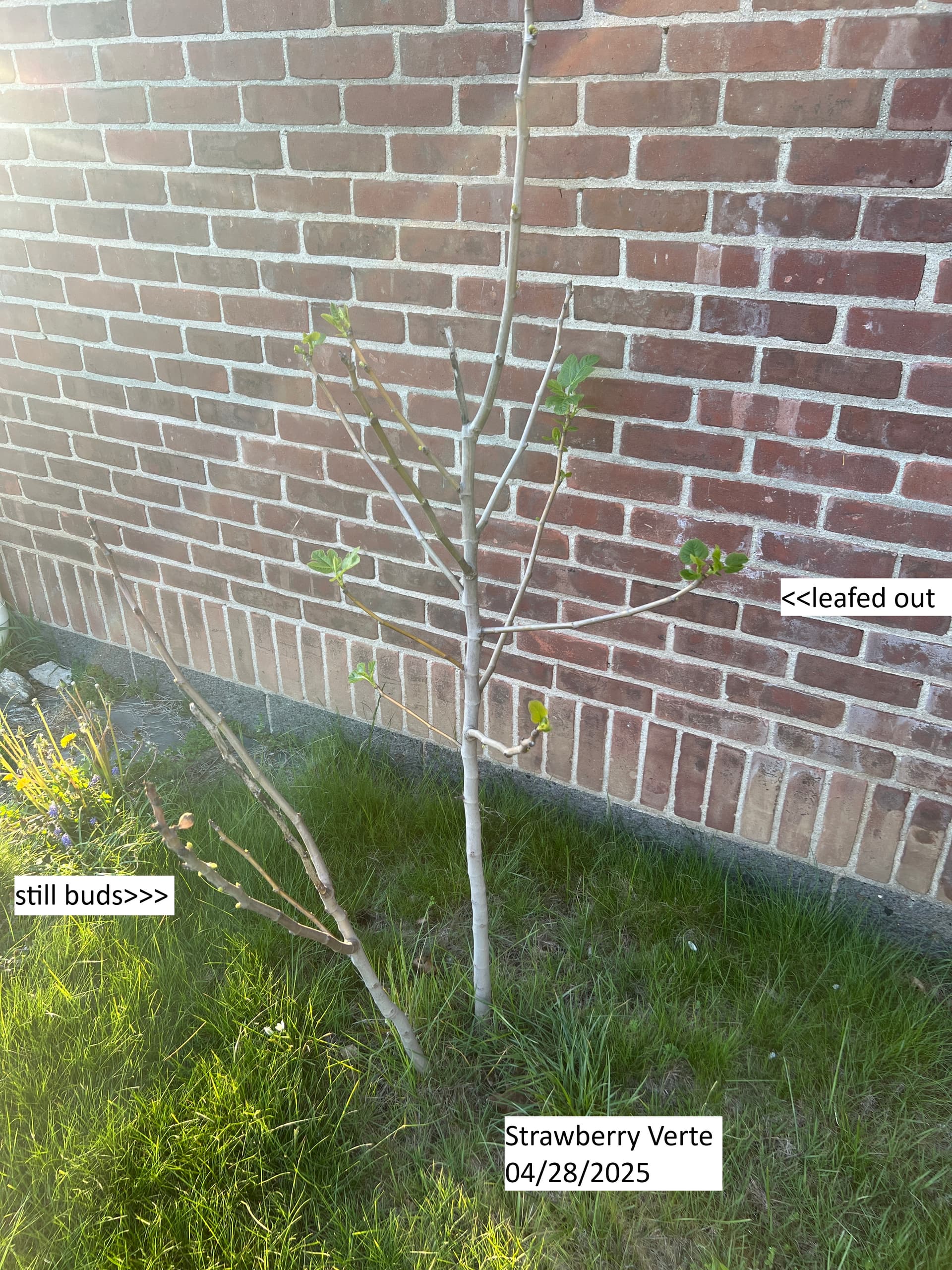 Hereās another property with a South facing brick wall. The part of the fig closest to the wall has already leafed out, while the part further away is just green buds. In this case, while both parts of it lived, it seems like it is the warmer spring temps near the wall which are causing the growth.