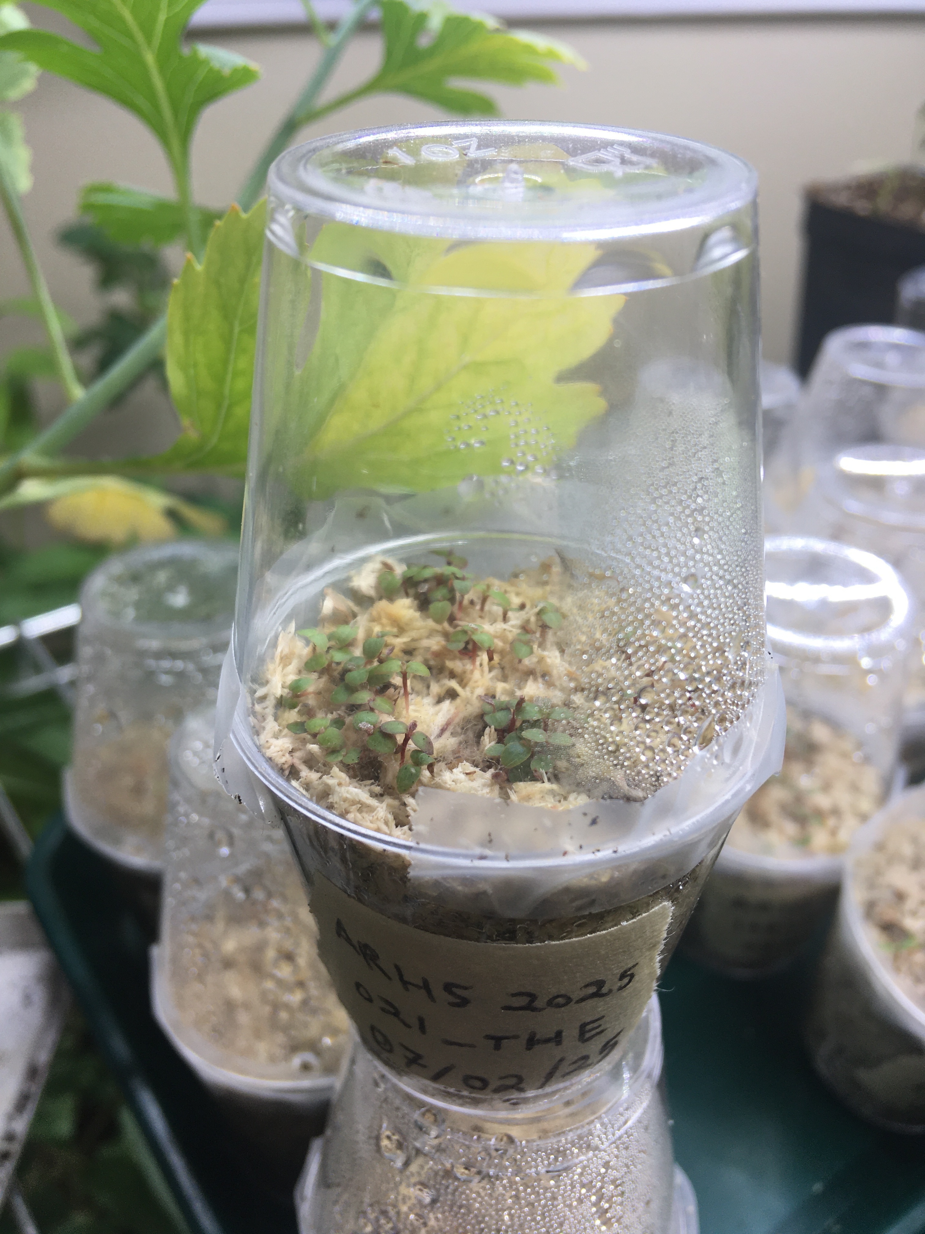 I start tiny seeds like that under lights by sprinkling them on sterilized sphagnum moss in mini plastic shot glasses—a pack of 30 is $3 here—then I mist them and tape another cup on top as a humidity cover. The cup fits easily in the butter keeper in the fridge to stratify. I find it’s an easy compact way to get a lot of seedlings without any weed competition or fungus gnats. You don’t need to open the cup until they get pretty big, usually it’s good for a few months.