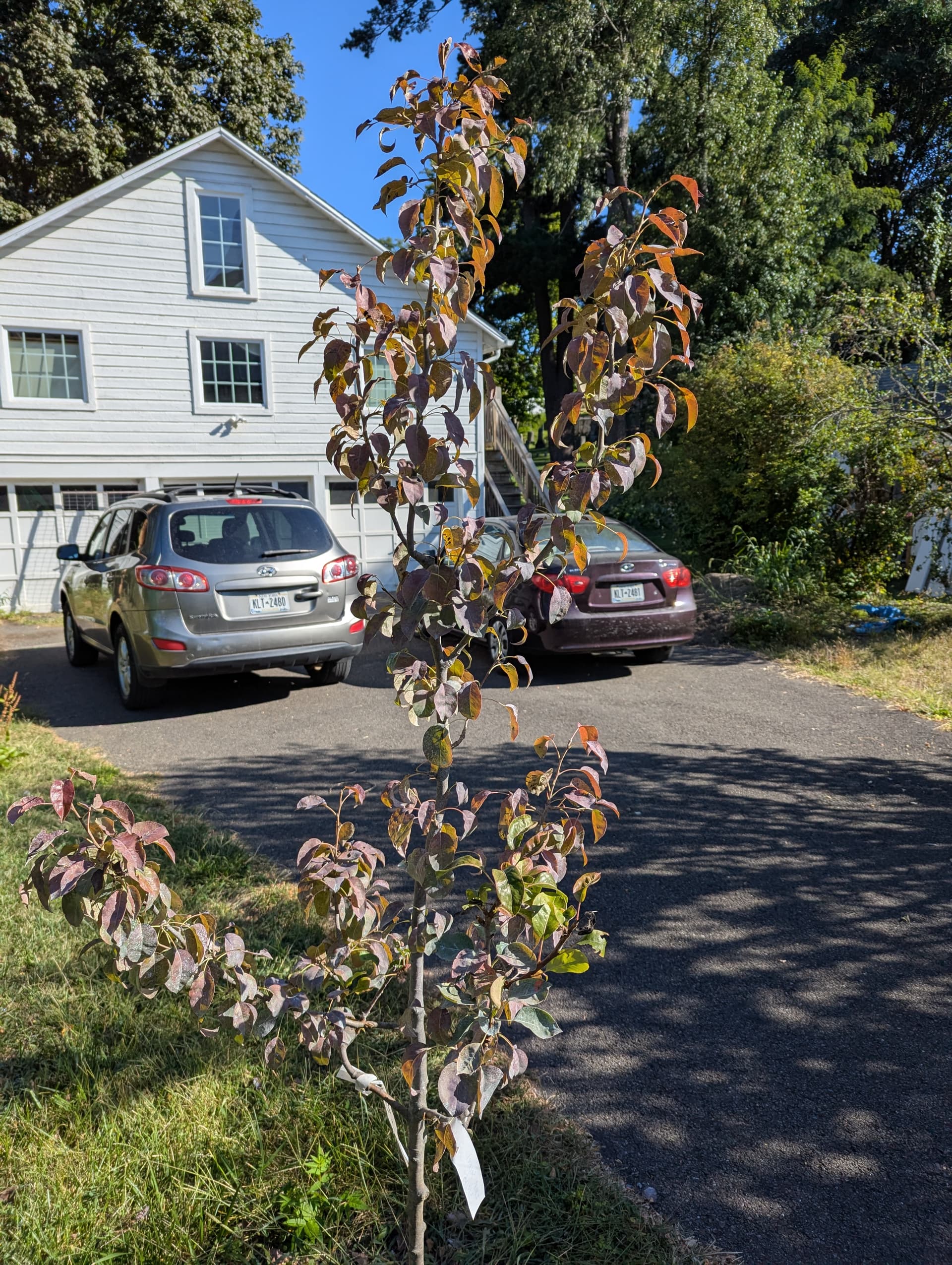 I planted this Comice pear 2 years ago. each Spring it looks healthy but then over the course of the Summer, it only grows a few inches and it dries out., is this fire blight? I successfully grafter another pear variety onto it and it seems less damaged by the disease- see the greener leaves in the lower right. Compared to my other red bartlet tree, this one just seems to be struggling considerably. I even used a disease resistance spray this year, but didn’t seem to address the issues.