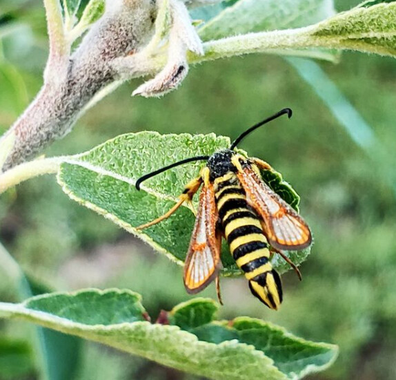 Found this insect last fall on my young golden russet apple tree. At the time I assumed it was some sort of wasp, but now I am thinking it was actually a moth. Hopefully it isnât some sort of borer? I have an old apricot tree and plum tree both with peach tree borer symptoms.